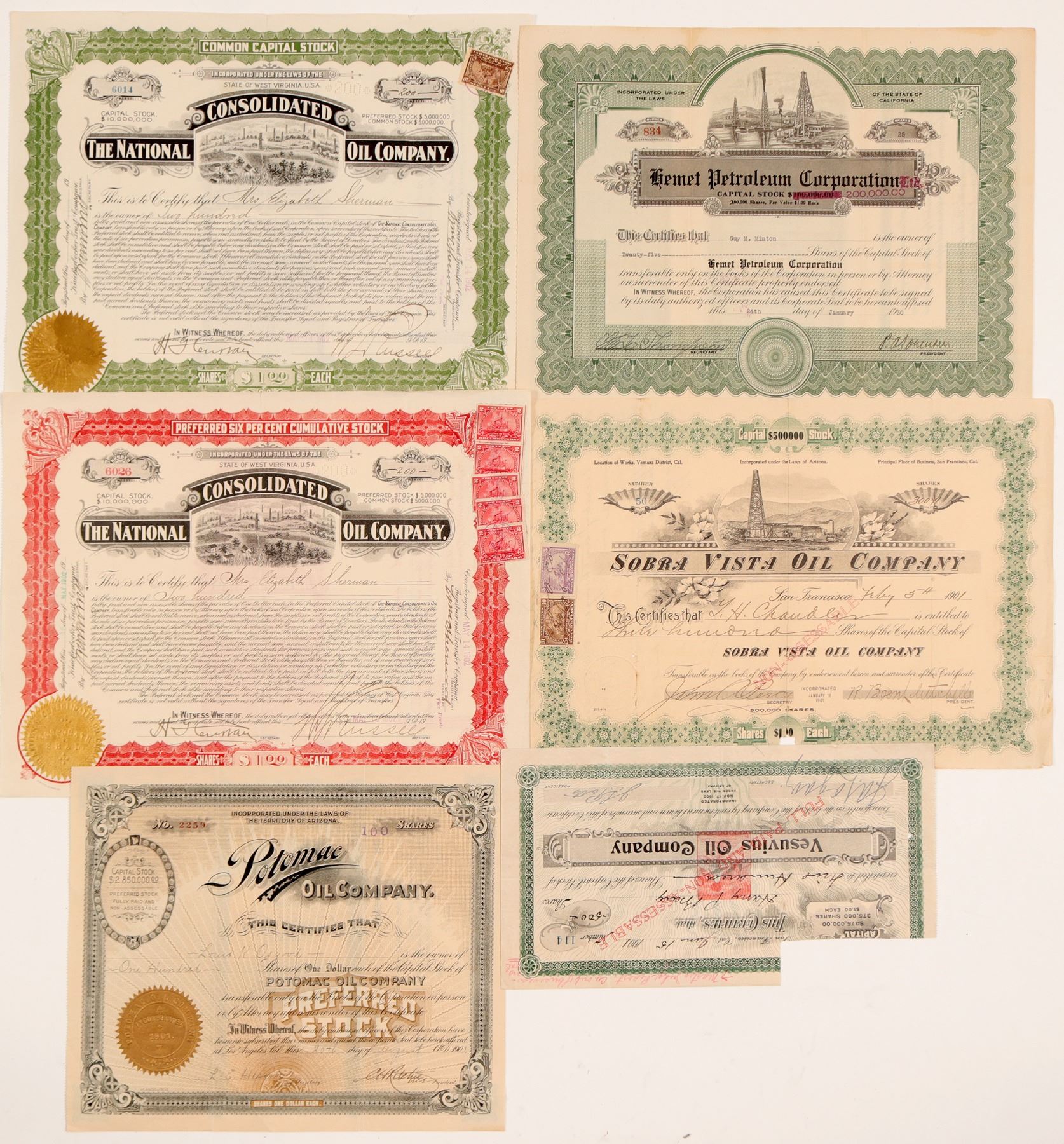 Lot of six. 1) National Consolidated Oil Company. # 6026. Fancy oilfield vignette with farm in foreground. Bright red border. 2) Same as one, but with green border. 3) Hemet Petroleum Corporation. Oil rigs on the water. 4) Sobra Vista Oil Company. # 50. Oil rig vignette with see through wall. Large tear bottom center. 5) Vesuvius Oil Company. Red underprint of Mt. Vesuvius. Top left corner torn off. 6) Potomac Oil Company. Striking black on brown safety paper. Ken Prag Collection