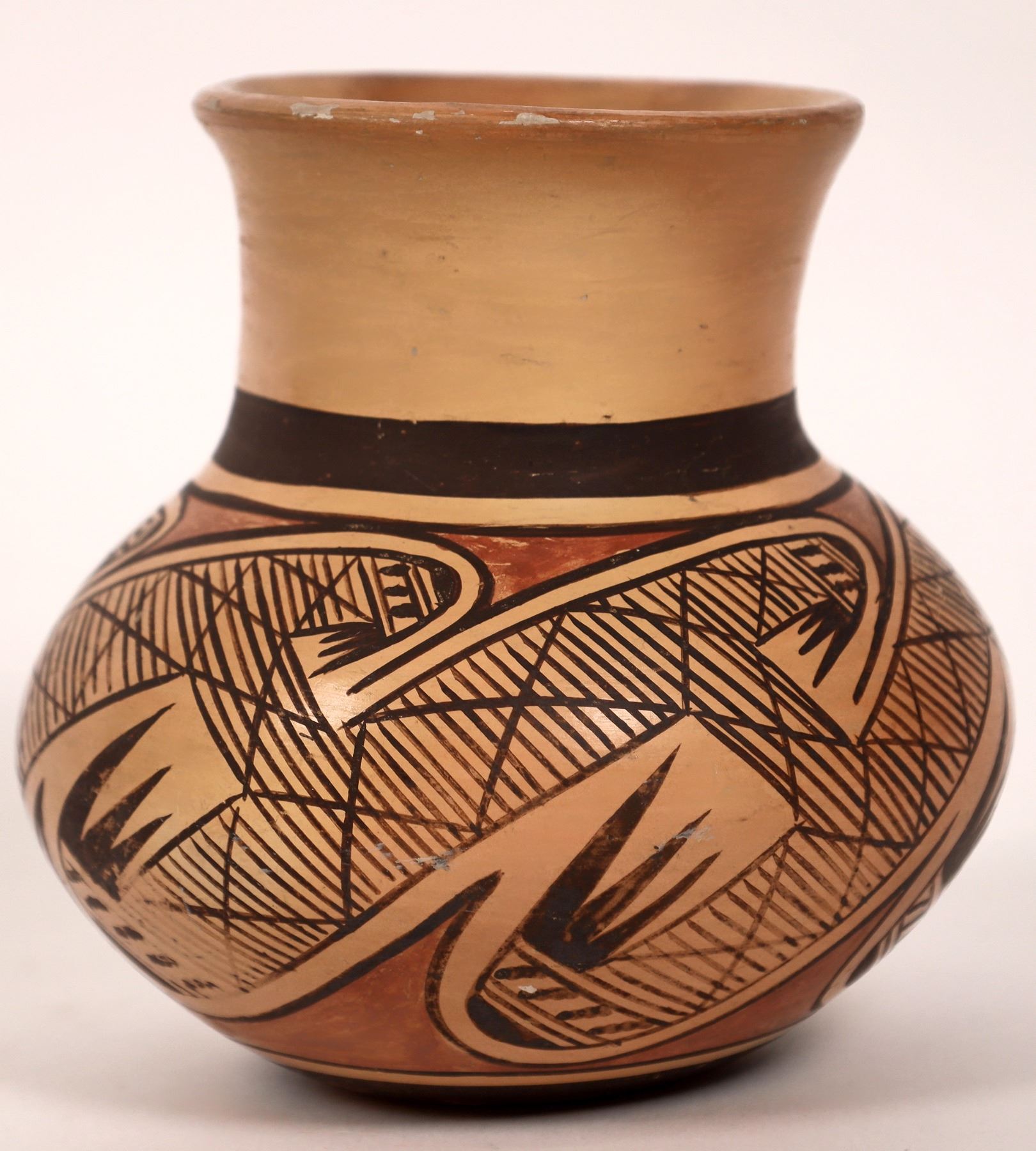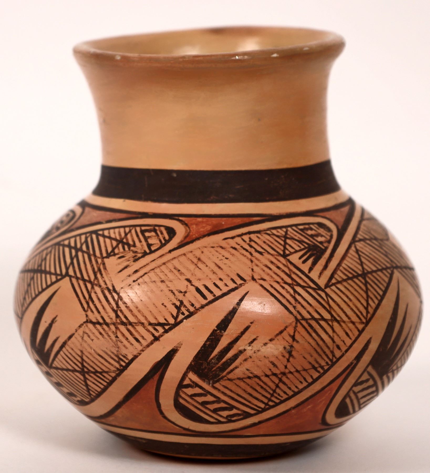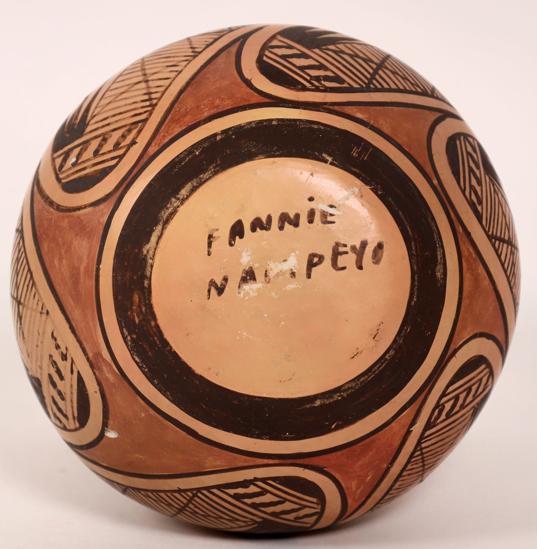 Small jar with feather design by Fannie Nampeyo (Hopi). Fannie Nampeyo (1900-1987) Migration pattern (lines/roads) on this jar represent the migration of the Hopi Pueblo people through four worlds. Fannie Nampeyo Polacca) was a modern and contemporary Hopi fine arts potter, who carried on the traditions of her famous mother, Nampeyo of Hano, the grand matriarch of modern Hopi pottery. Incredible piece from Hopi! 4.75" x 4.75"