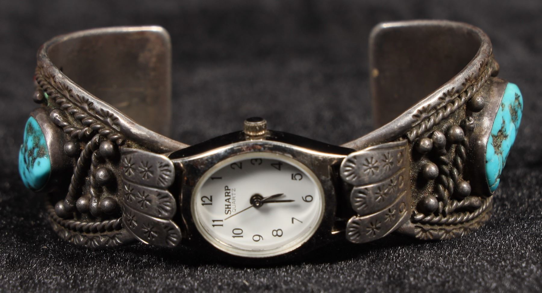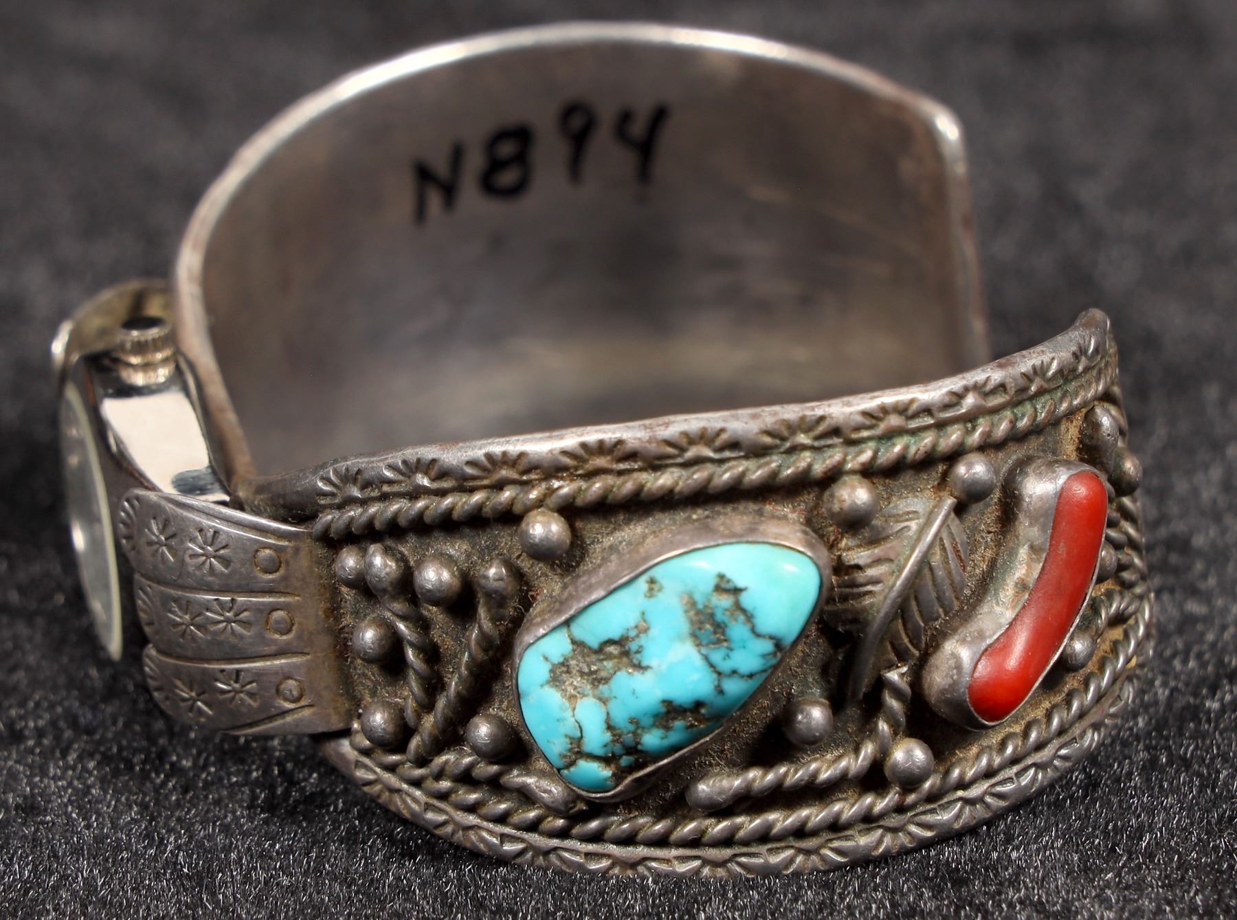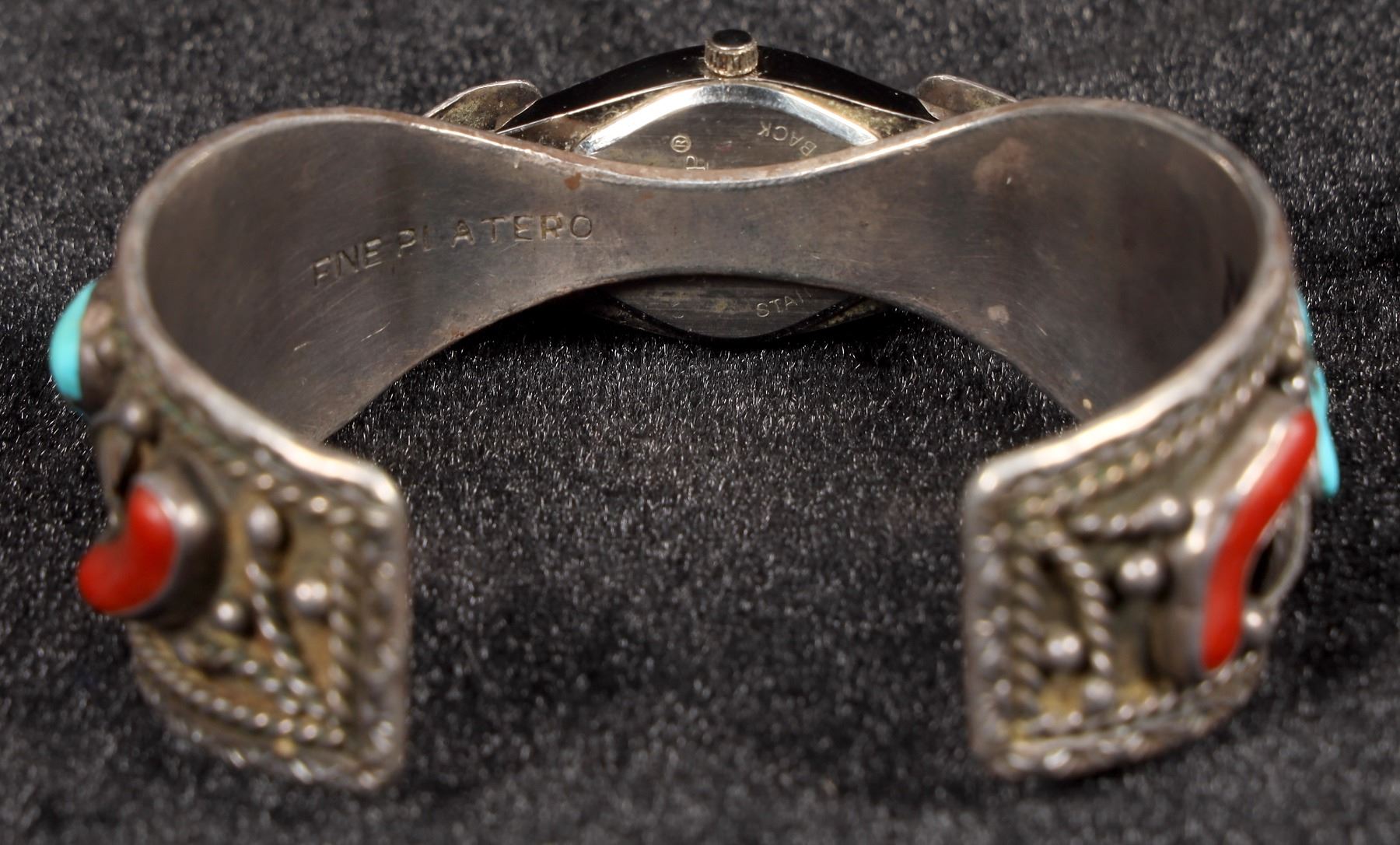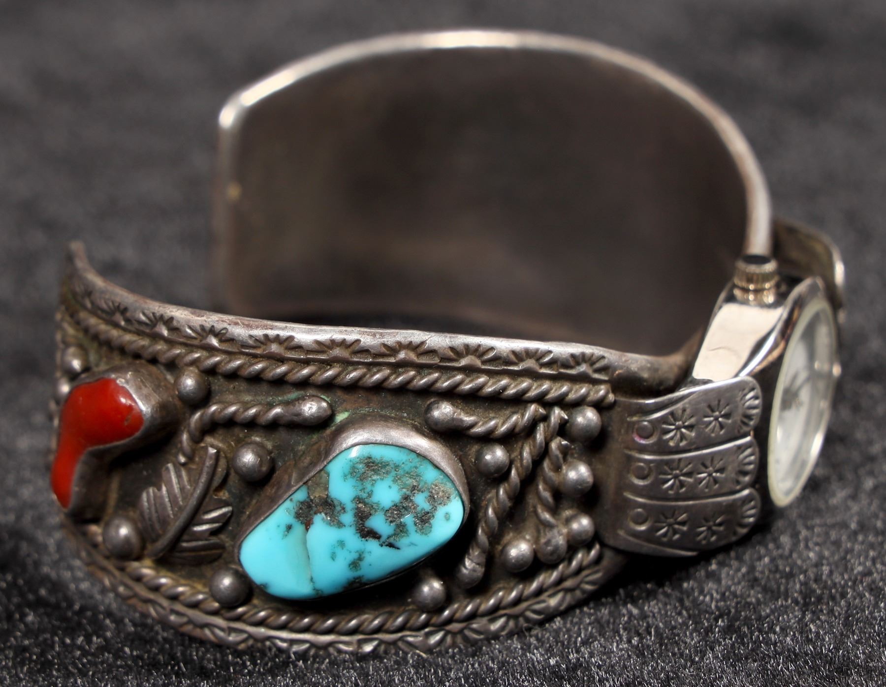This is a vintage Navajo made watch bracelet by silversmith Fannie Platero, both sides of the 1" sterling band have a single piece of turquoise and coral in the design, the band has a great old build up of patina but will polish to bright silver if desired, the watch is in good working condition and currently running well, the piece is signed FNE Platero.