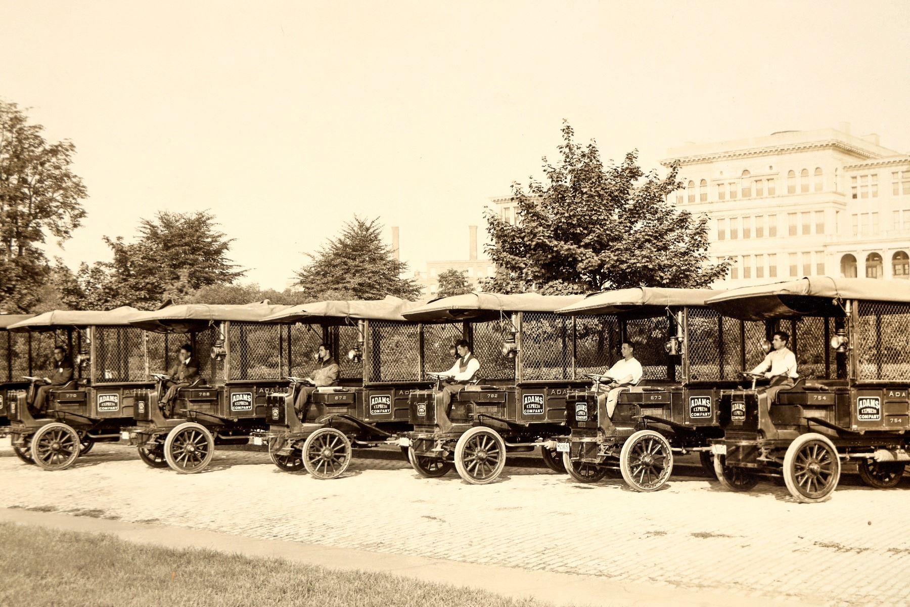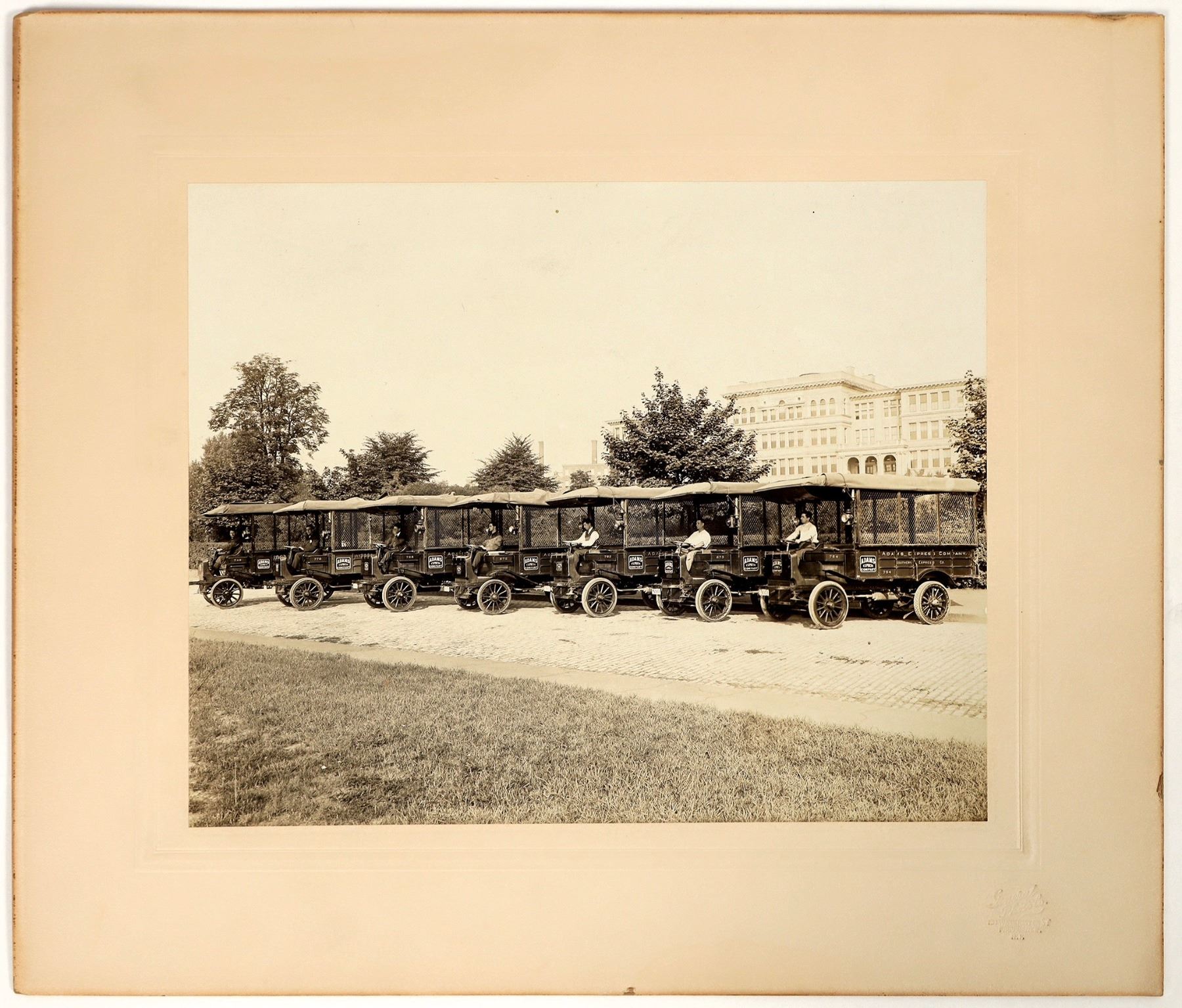 Large mounted photograph (12 x 14" mount) of seven Adams Express Co. / Southern Express Co. early express vehicles and drivers, c.1910. Photo by General Photo Co., Providence, Rhode Island. Great contrast and detail! Very rare view. They started using these vehicles c.1905-10.