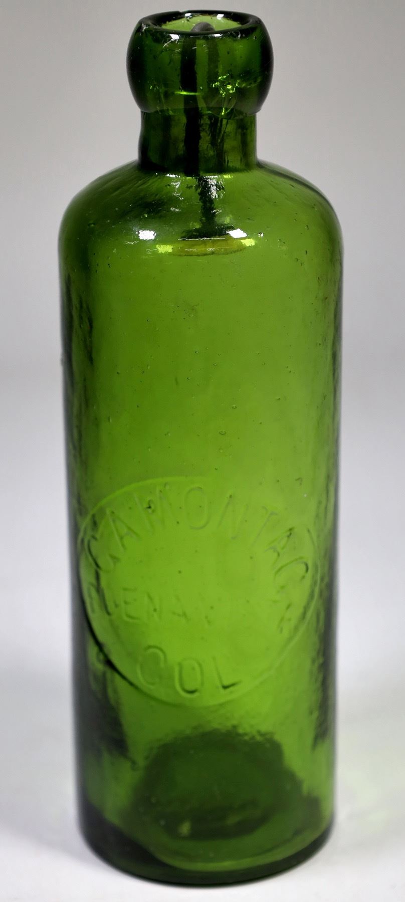 G A MONTAG/BUENA VISTA/COL Bright green, 7 5/8" tall. Applied top. Preble dates this c. 1887-88. Made at Colo. Glass Works. Still contains metal stopper. One nick to outside rim with corresponding bruise to the inside lip. Partially open, very shallow 1/8" bubble on reverse below the shoulder. Display piece if I ever saw one! Unique color! Please see pictures for more detail.