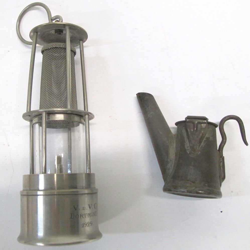 Stunning looking stainless steel Davy style miners lamp dated 1929. Etched V. D . V. G. / Dortmund / 1929. Appears to be a presentation piece and never lit. 6" tall. 7.75" with top ring. A must for any mining lamp collection. George Anton oil wick lamp, Monongayleha City, Washington Co, PA. HWAC# 62108 Date: Location:
