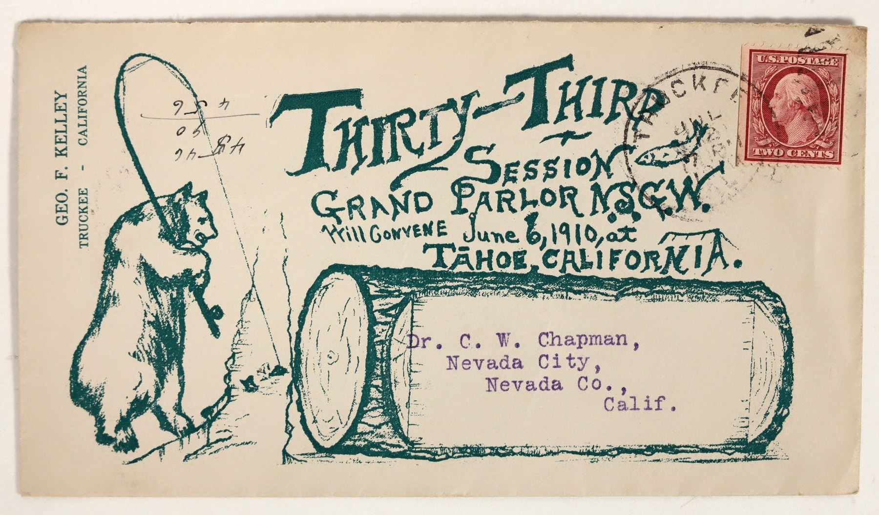 You probably aren't going to find a better looking Truckee/Tahoe postal cover. This is the first time we've sold this. It is a companion piece for the gorgeous badges that were created for this Tahoe gathering of the NSGW. Full face illustration of a bear with fishing pole. Sent from Geo. Kelley of Truckee to Dr. CW Chapman on Nevada City. Truckee cancel over 2 cent stamp. Advertising the June 6, 1910 session of the Grand Parlor of the NSGW that would take place in Tahoe City.
