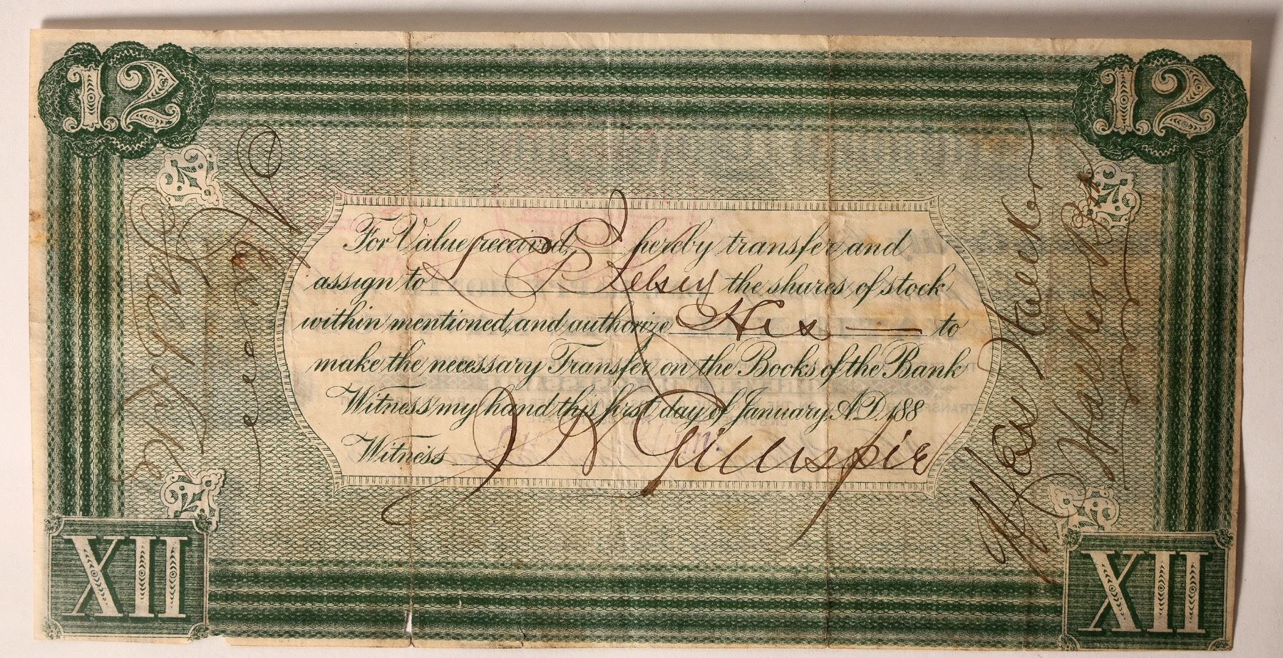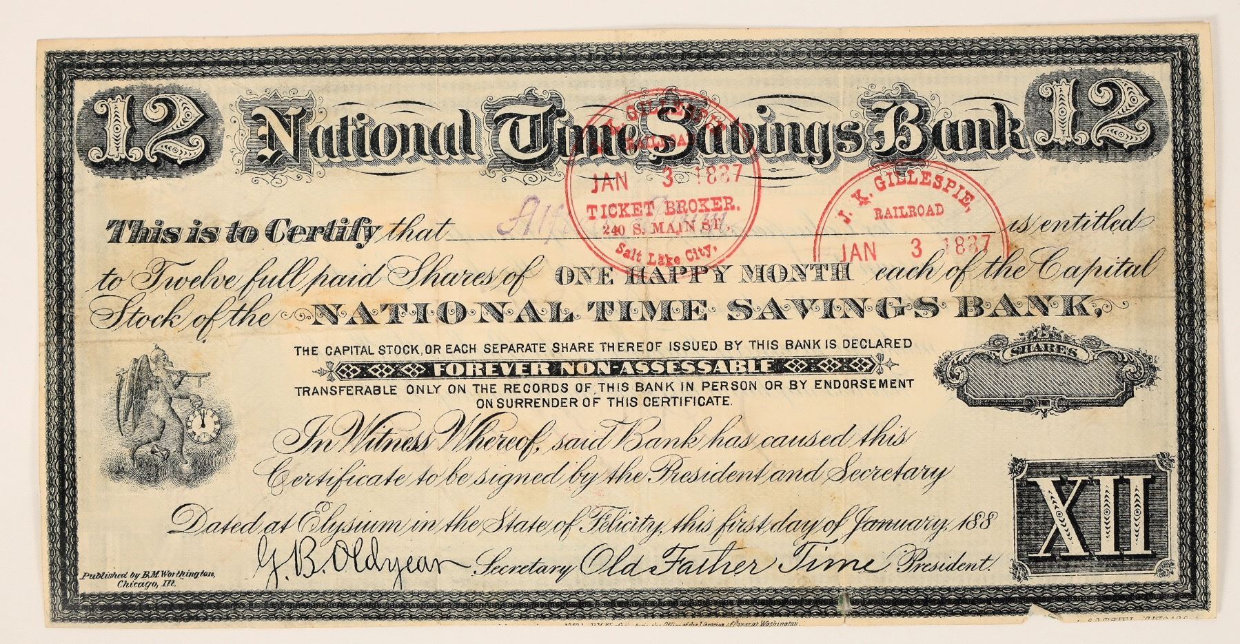 1887 National Time Savings Bank fantasy currency, $12. Old Father Time, president![