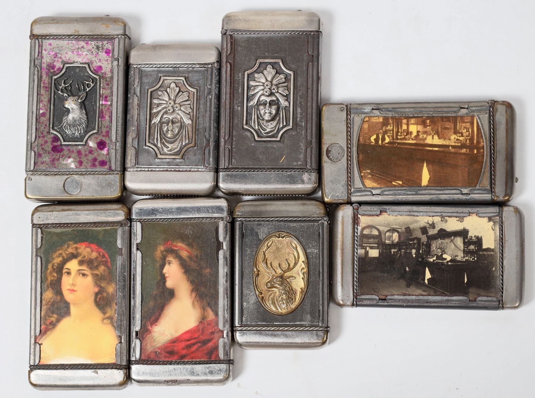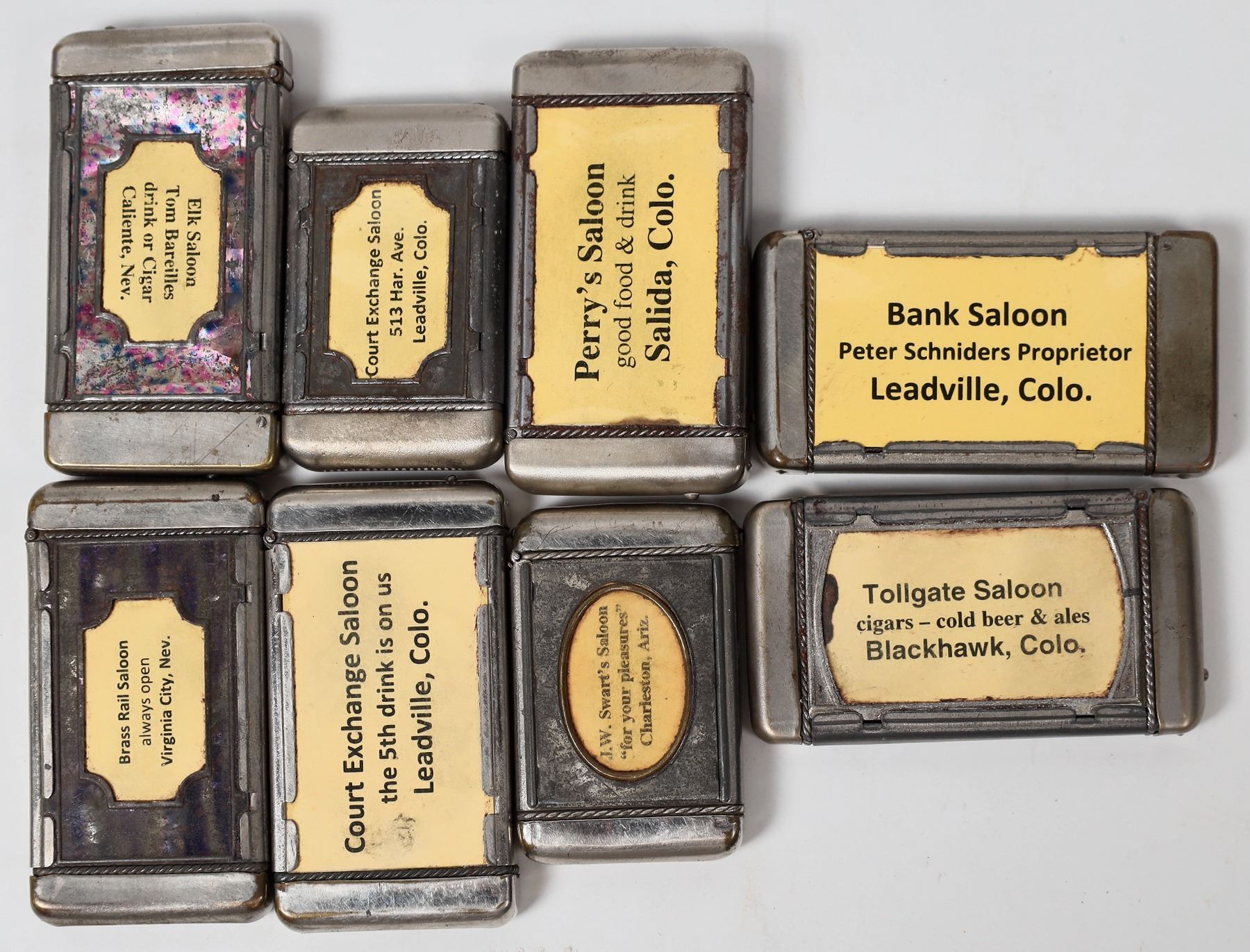 Lot of 8 match cases from various saloons in Colorado, Nevada, and Arizona. The cases are real but the paper advertisements under the celluloid are not. The paper advertisements are for the following saloons: Elk Saloon in Caliente, NV, Tollgate Saloon in Blackhawk, CO, Court Exchange Saloon in Leadville, CO (2), Perry's Saloon in Salida, CO, Brass Rail Saloon in Virginia City, NV, J.W. Swart's Saloon in Charleston, AZ, Bank Saloon in Leadville, CO. Average size is about 2.75 x 1.5 inches.