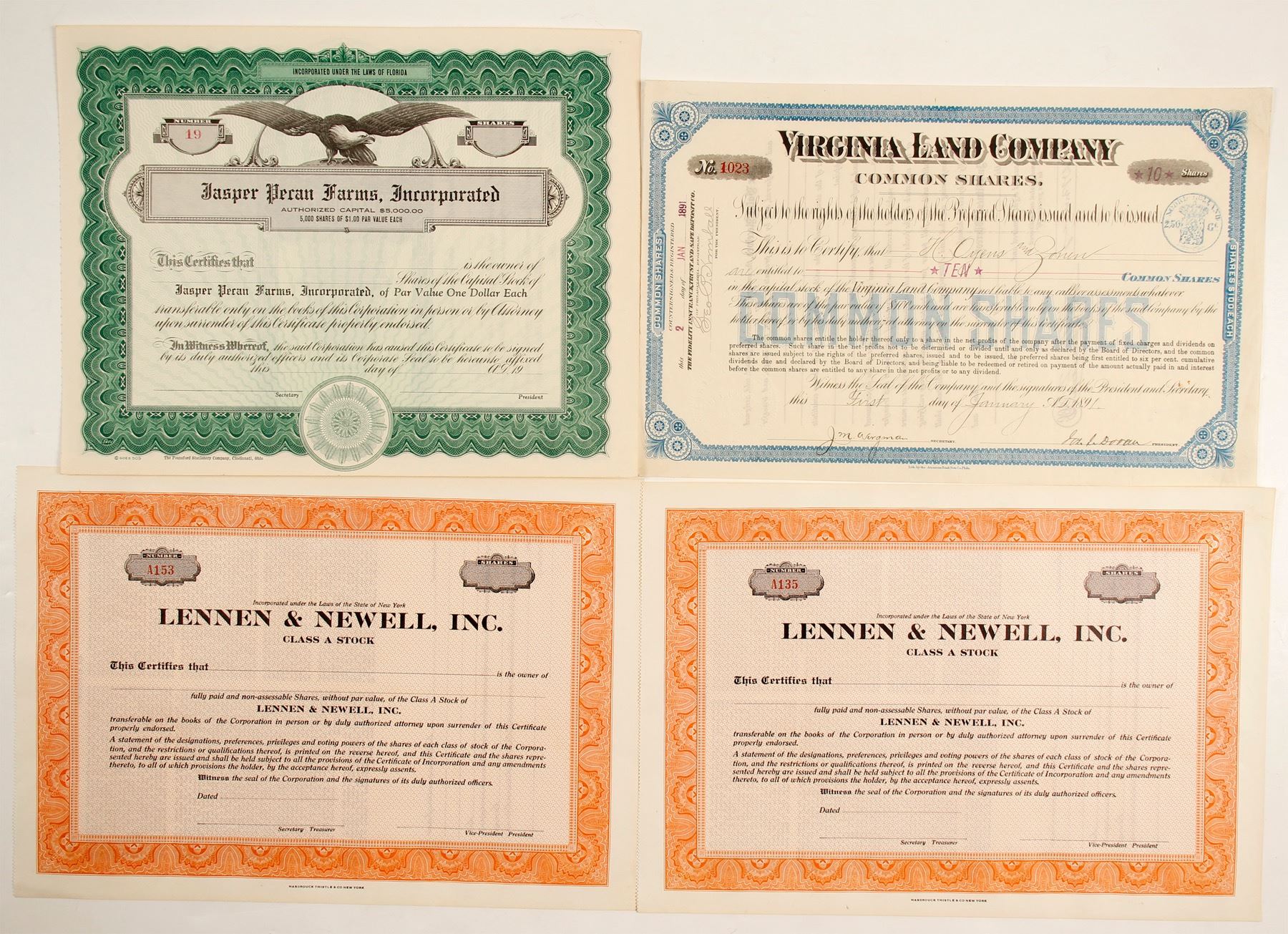 Includes: Virginia Land Company, Common No 1023 for 10 shares, signed by J. R. Doran(?) President; Jasper Pecan Farms, Inc., No. 19, unissued; 2 Lennen & Newell, Inc. No. A153, A135