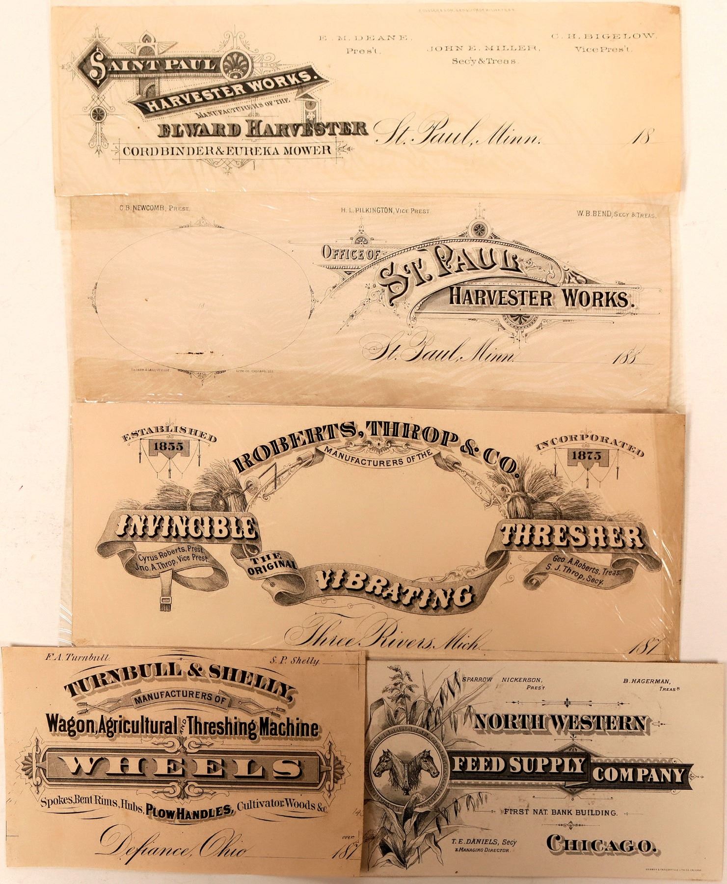 Lot of five advertising coupons for businesses specializing in farm equipment, in Illinois, Ohio, Minnesota and Michigan, c1870-1888. Larger three are approx. 4 x 8 inches. Includes two business cards, 3 x 5 inches. Some are printed by Shober & Carqueville Litho Co., Chicago, and H. Gugler and Son, in Milwaukee. Printers' proofs are a print or object that the manufacturer or printer receives as proof of their work. For further details, see photo.