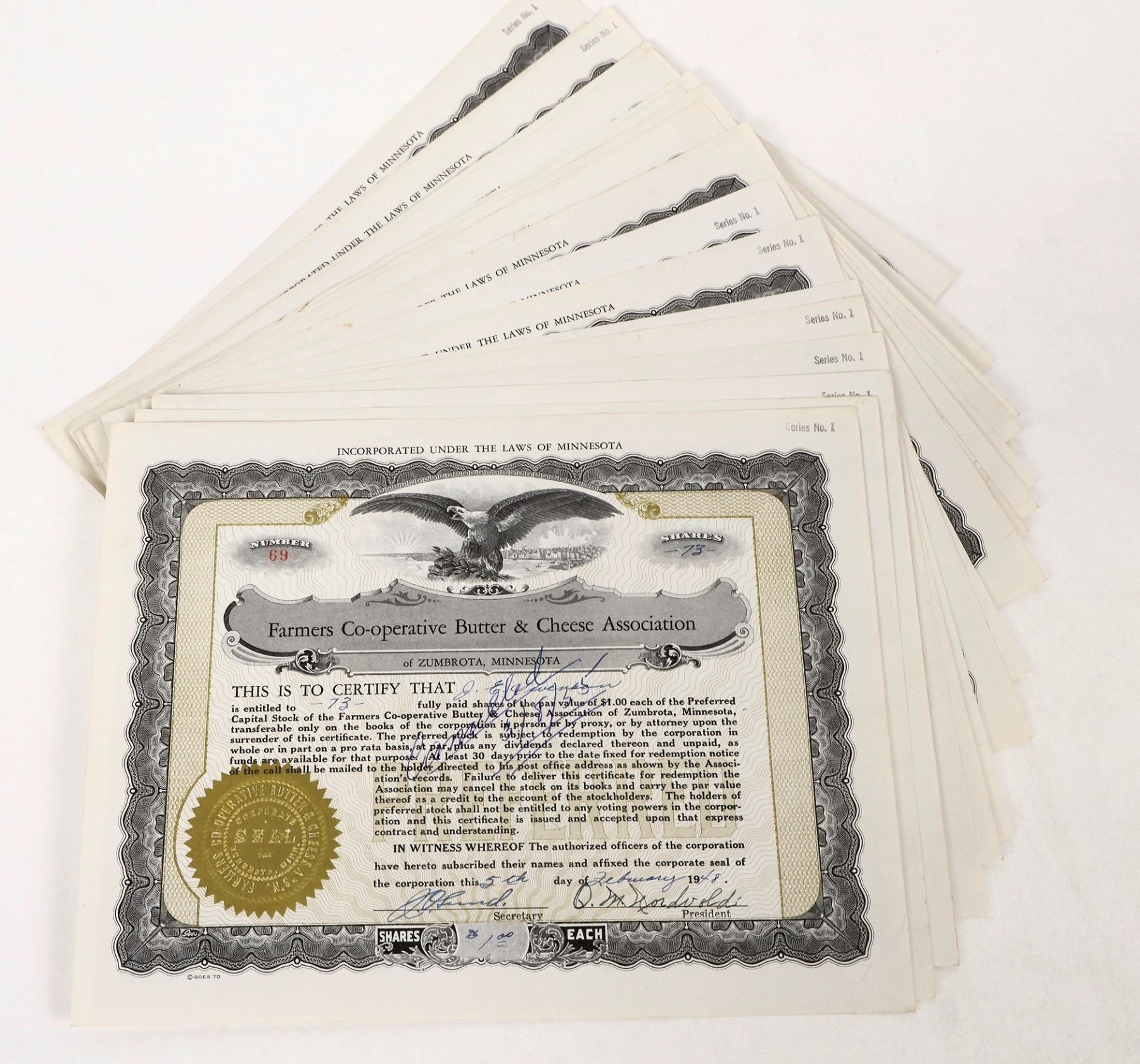These are over 25 stock certificates for the Farmer's Co-Operative Butter & Cheese Association in Minnesota. Please see photo for details.