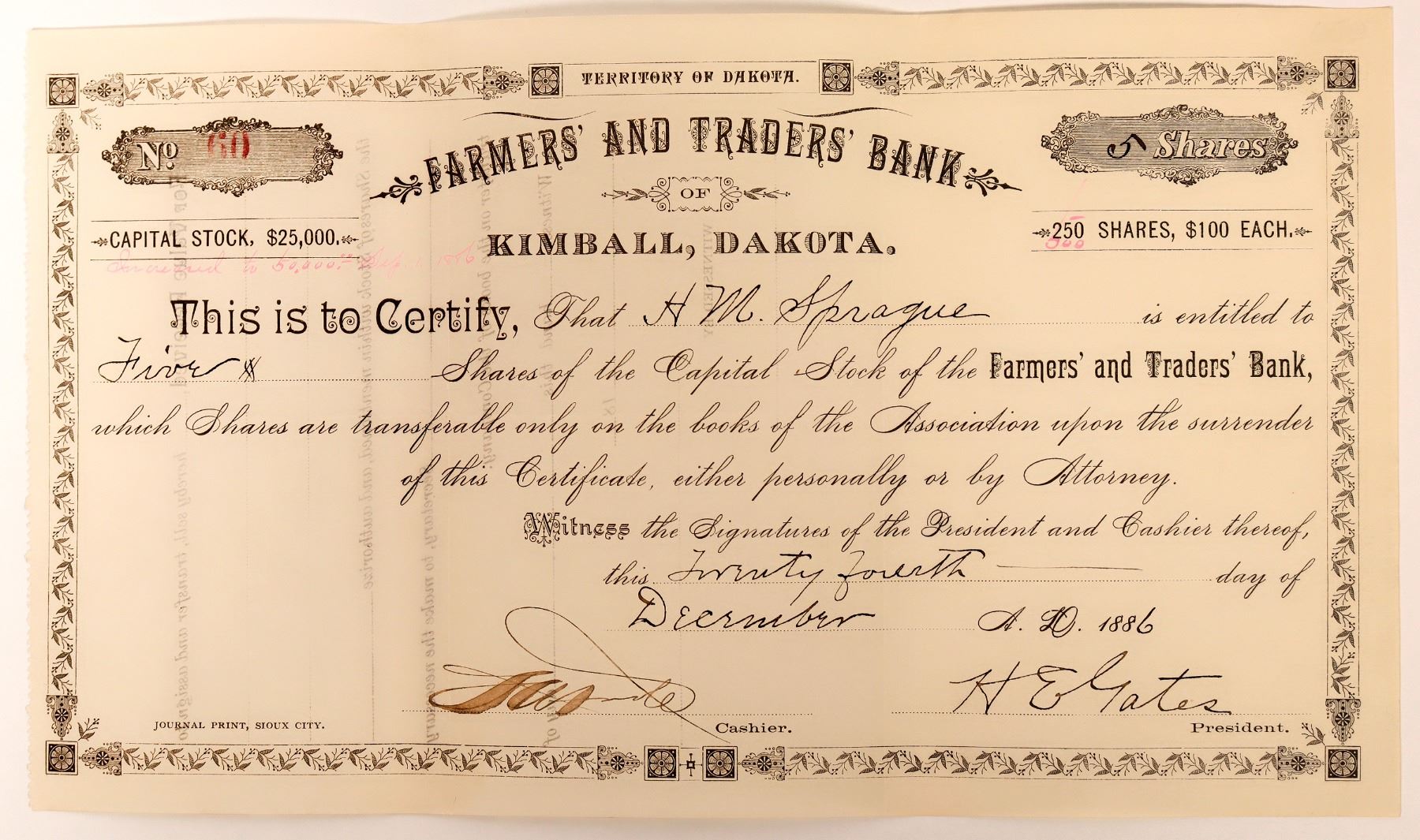 Very rare stock certificate from Dakota Territory. Cert. #60, issued for 5 shares to H.M. Sprague in 1886, and signed by H.E. Gates as president. Small float with only 250 total shares authorized with total capital of $25,000. We don't believe we have ever seen this one before. Journal Print, Sioux City. VF. Uncanceled.