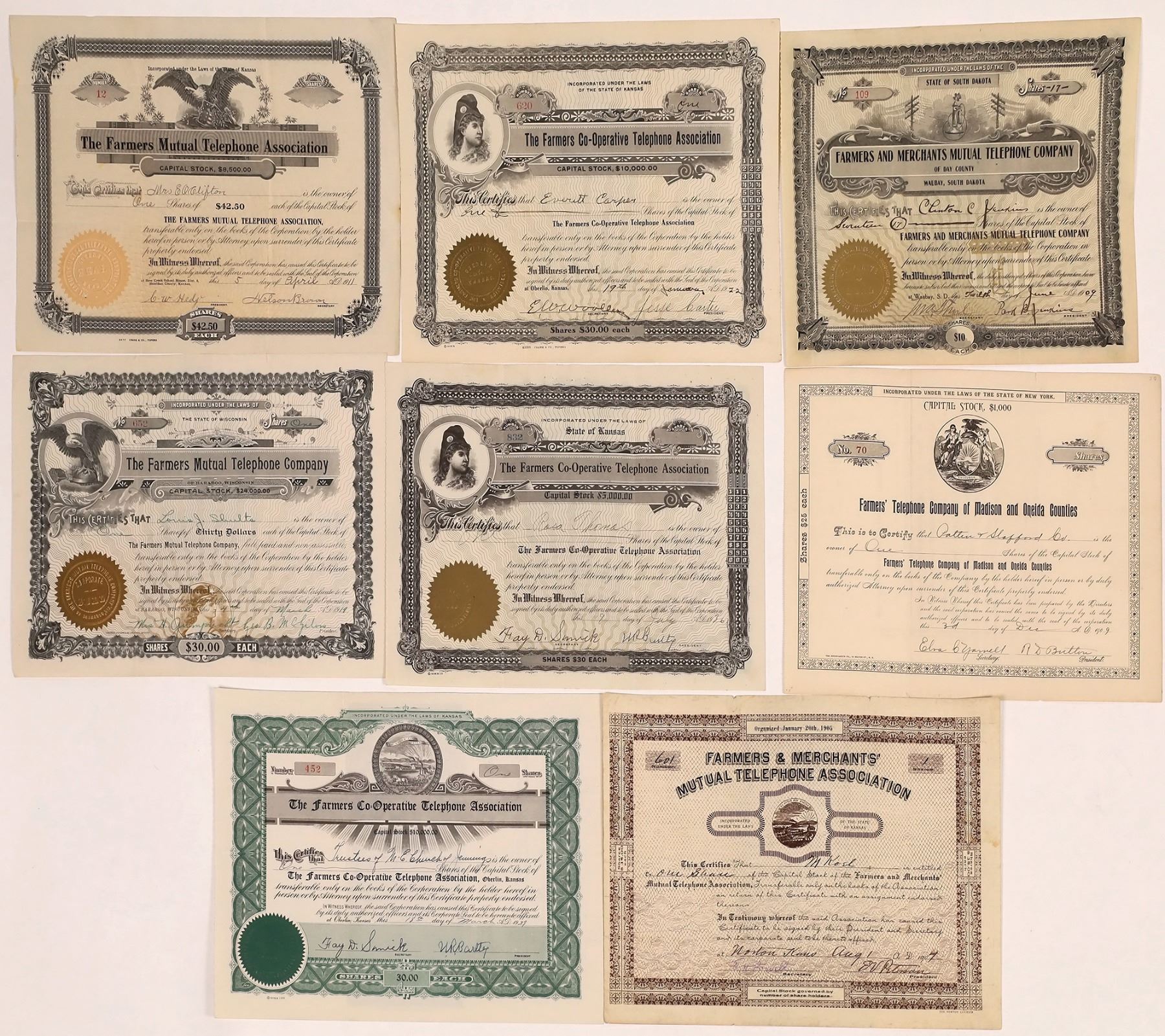 Lot of 8, most different. Included: Farmers and Merchants Mutual Telephone Co. (Waubay, South Dakota, 1909); Farmers & Merchants' Mutual Telephone Assoc. (Norton, Kansas, 1907); Farmers Co-Operative Telephone Assoc. (Oberlin, Kansas, 1922, 1936, and 1939); Farmers Mutual Telephone Co. (Baraboo, Wisconsin, 1919); Farmers Mutual Telephone Assoc. (Sheridan County, Kansas, 1911); and Farmers' Telephone Co. of Madison & Oneida Counties (NY, 1909).