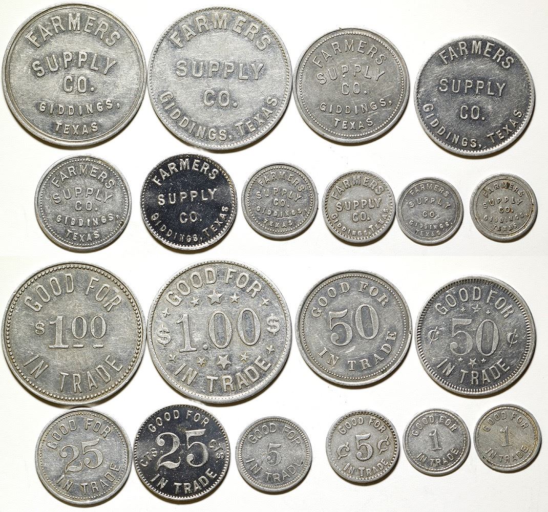 Ten tokens. Looks to be two complete sets. 2 1c, 2 5c, 2 25c, 2 50c, and 2 1.00. Giddings is a RR town founded in 1871 75 miles east of Austin. HWAC# 62735 Date: Location: Giddings, Texas