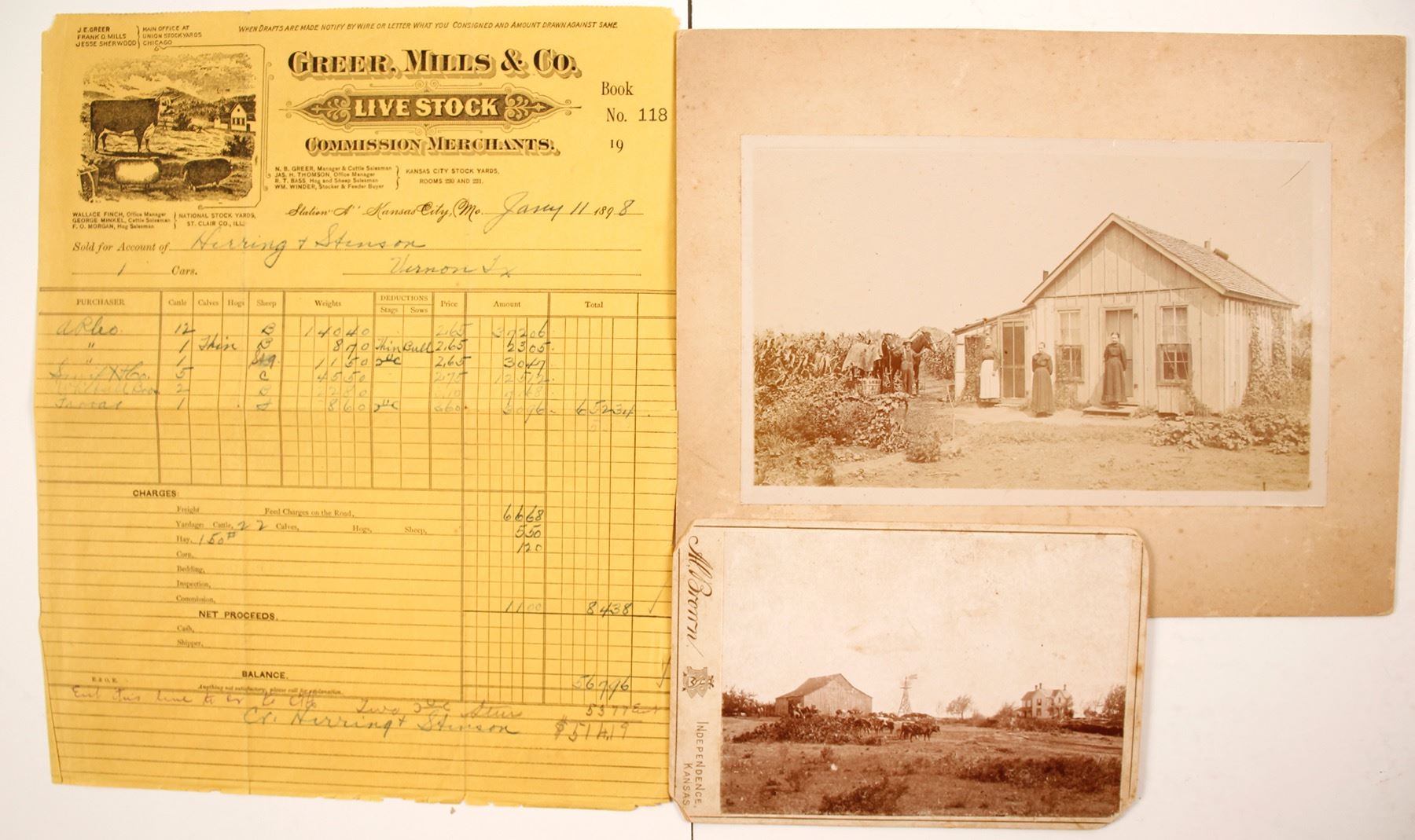 Lot of 3. 1) Mounted photograph of farm homestead in Norfolk, Nebraska. Farmer with horses and three women. 5 x 8" on 8 x 10" mount. Stamped on the back, C.P. Michael, Norfolk, Nebr. 2) Cabinet card of ranch house and barn with windmill, cattle, and cowboy on horseback. By Al Brown of Independence, Kansas. 3) Pictorial billhead fro Greer, Mills & Co. Livestock Commission Merchants, Station "A", Kansas City, Missouri, 1898. For sale of cattle going to Vernon, Texas. Vignette of livestock.