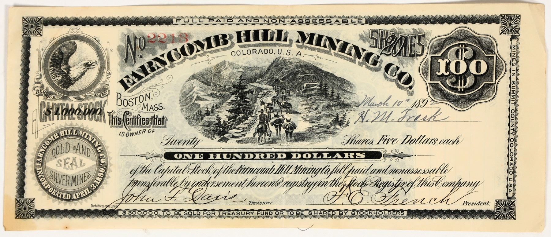 "Mines in Summit County Colorado" (printed on right border). Unusual stock certificate design and allocation meant to look like scrip or currency. No. 2213, issued for 20 shares to HM Trask in 1892. Signed by president F.E. French and treasurer John F. Davis. Vignette of miner leading burros up a hill and also a small eagle vignette. Folds, bent corners, some stains. 3.75 x 9" Farncomb Hill is located in the Breckenridge District, Summit County, Colorado. Fabulous gold specimens from this mine are world famous.
