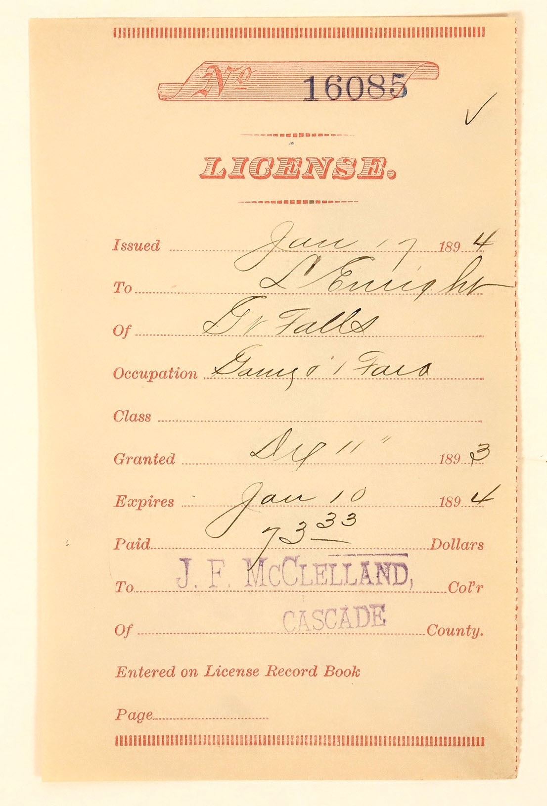 A license issued to J.F. McClelland of Great Falls, Montana in 1893. The license entitles McClelland to run a faro table, a card-based gambling game. The license lists the amount paid by McClelland, the date granted, and the date of expiry. It is printed with details filled in by hand and with stamps. Excellent condition.