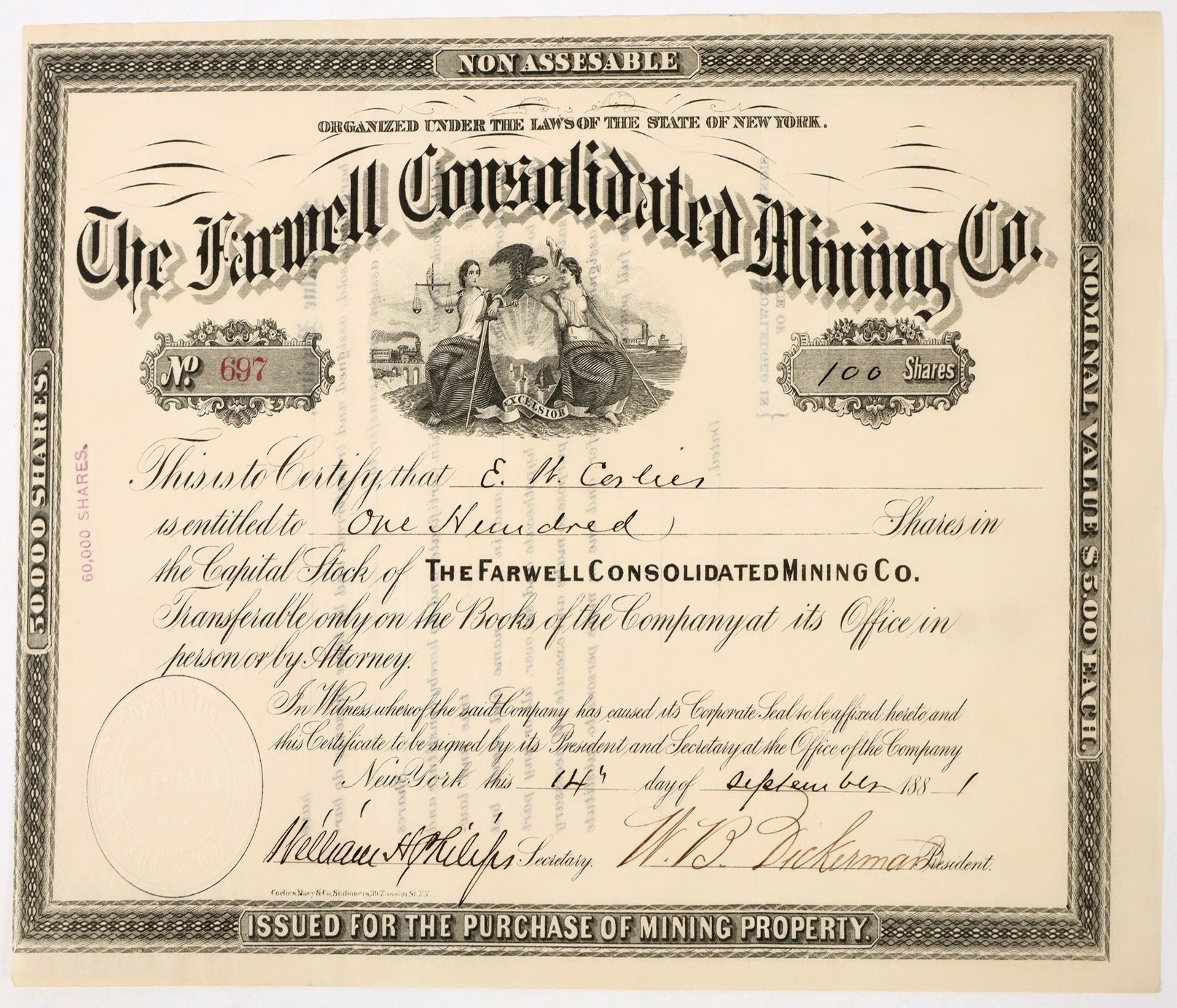 Rare. Colorado ghost town. Issued in 1881 for 100 shares and signed by president Dickerman. Not cancelled. In 1881, the Farwell Consolidated Mining Company, a group of investors from Leadville, bought all the mining claims and built a sawmill and stamp mill in Independence, Colorado. Just two years after gold was discovered, Independence was home to some five hundred residents with restaurants, saloons, a newspaper, and other retail establishments. The mining company took out $190,000 worth of ore over the next two years, almost five million in today's dollars. 7" x 9.75"