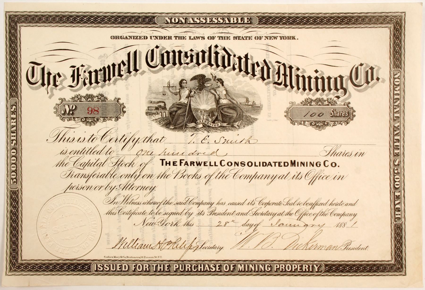 # 98 for 100 shares to TE Smith. Signed by WIlliam Phillips and president WB Dickerman. Dateline 1881 New York. Allegorical vignette. Incorporated in New Yoirk, Colries, Macy & Co. printers. Holes where seal was punched. Otherwise no issues!!! Rare. Colorado ghost town. In 1881 the Farwell Consolidated Mining Company, a group of investors from Leadville, bought all the mining claims and built a sawmill and stamp mill in Independence, Colorado. Just two years after gold was discovered, Independence was home to some five hundred residents with restaurants, saloons, a newspaper, and other retail establishments. The mining company took out $190,000 worth of ore over the next two years, almost five million in today’s dollars. 7" x 9.75". Prag Collection State: Colorado City: Independence Date: 1881 HWAC# 81922