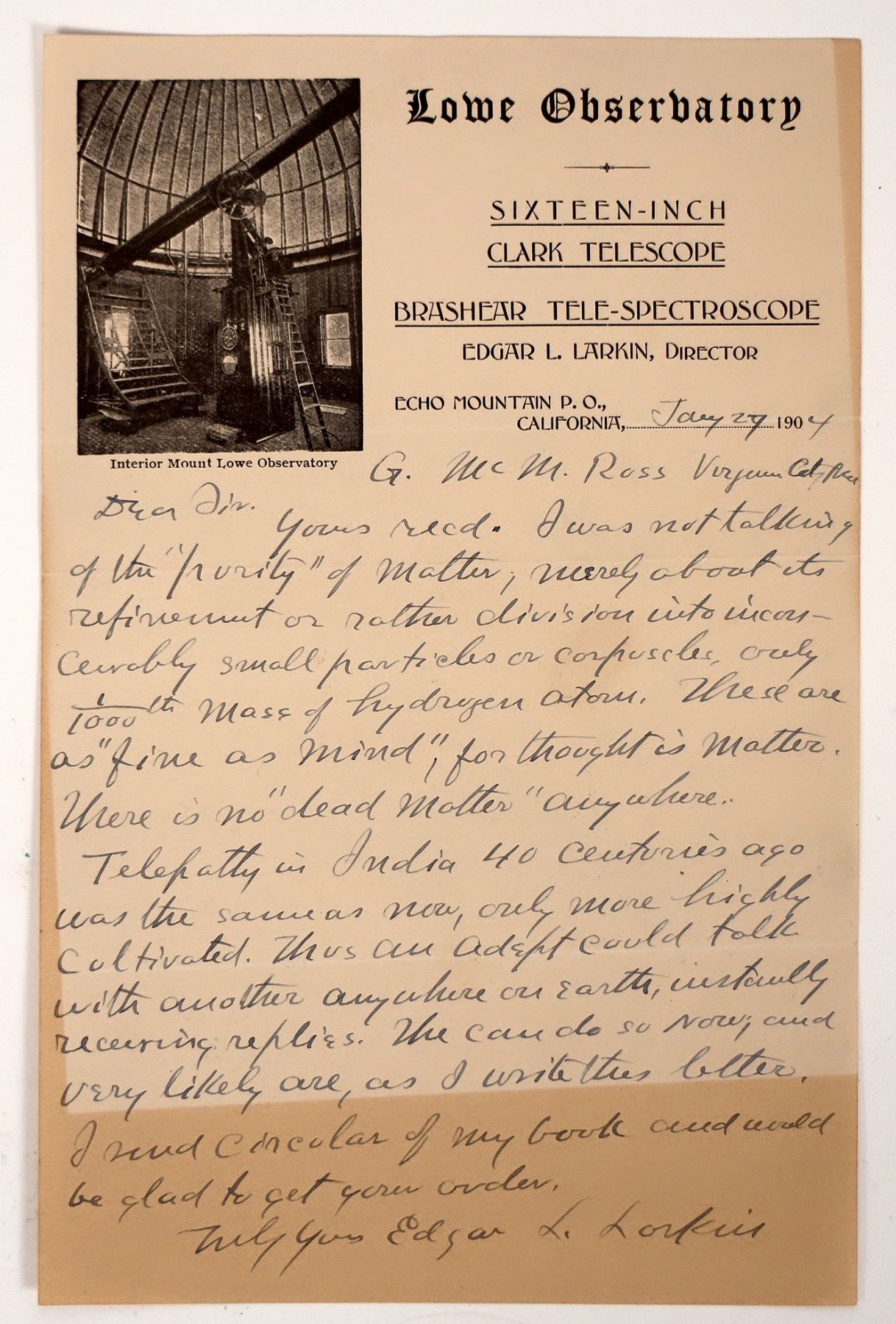 Letter is on pictorial letterhead for the observatory and has a photo vignette showing a large telescope. Addressed to GMM Ross in Virginia City, Nevada, a prominent Comstock mine superintendent. Content is highly unusual, referencing the nature of matter and particles, as well as the existence of telepathy. Signed by Larkin. Larkin was known as the "Wizard of Echo Mountain." He was a self-taught astronomer who took over the Lowe Observatory in 1900. He gave popular lectures and was the author of a few books and many articles, on topics from astronomy to Hindu, Greek and Egyptian philosophies, and to the mysteries of the occult and the lost continents of Atlantis and Mu. 8.5 x 5.5" Heavy toning.