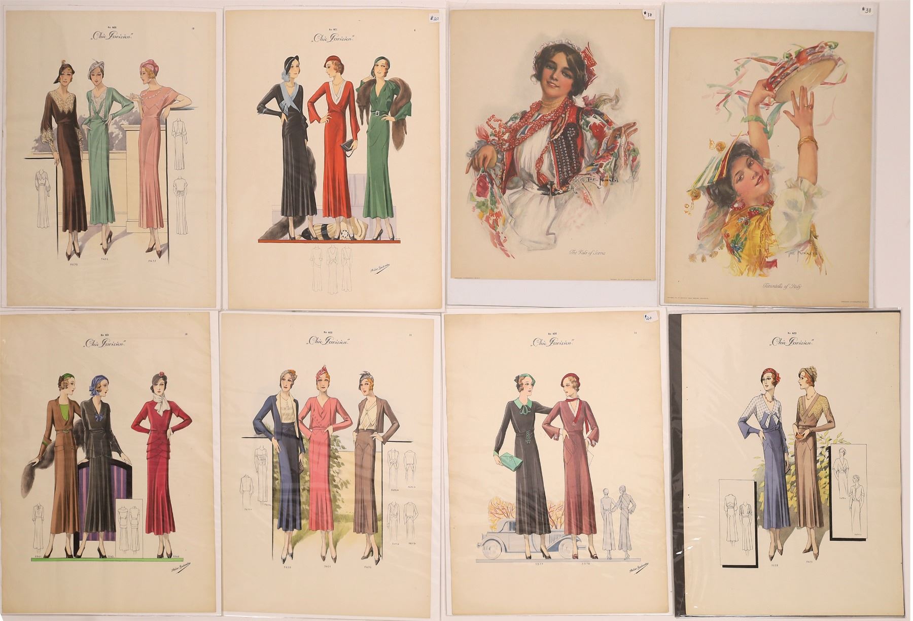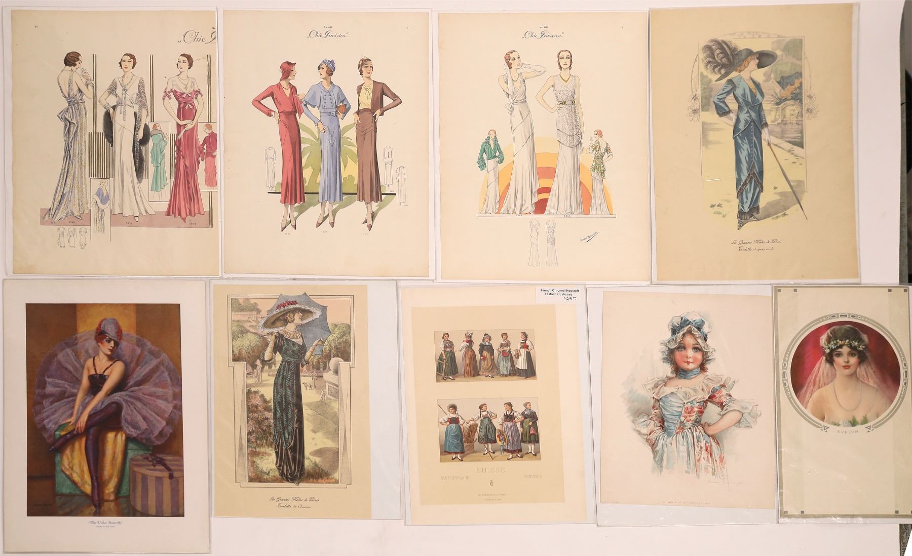 A collection of high fashion drawings (15) from Chic Parisian. The colorful sketches measure 12"x 16" and are mounted on poster board, ready for framing. Please see photos for more detail and condition.