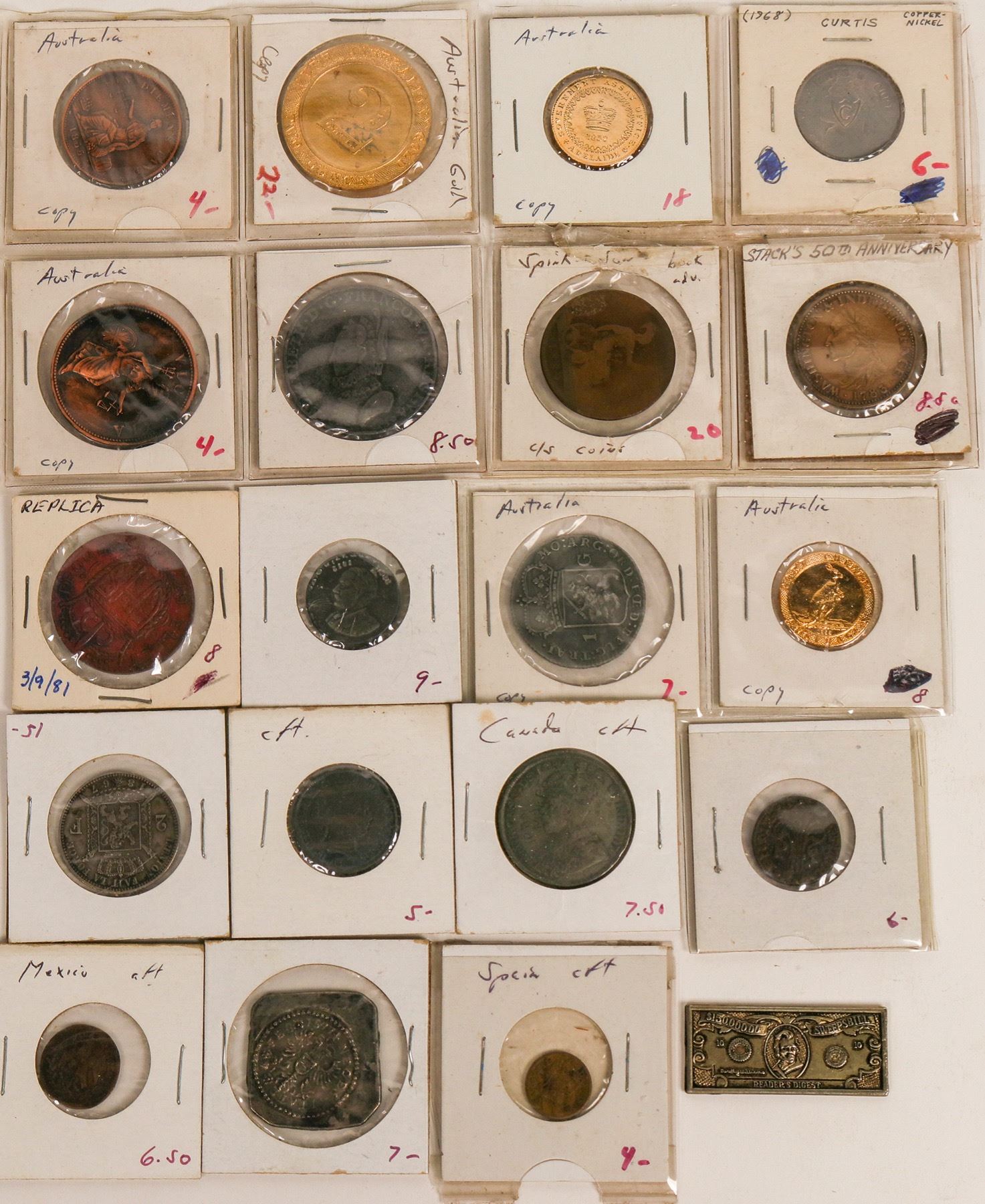 These are fantasy, facsimile of fake tokes. Lot of 21. Most interesting might be an advertising piece of Spink & Son for counterstrkining on copper and bronze coins. Stacks auctions 50th. Counterstrike with '1813' backwards! Small golden rectangular $150,000.00 money. 1850's Australian Coin counterstamped 'This is not a Coin.' We have sorted these tokens into lots, but have not high graded them. There are sure to be some fabulous finds!
