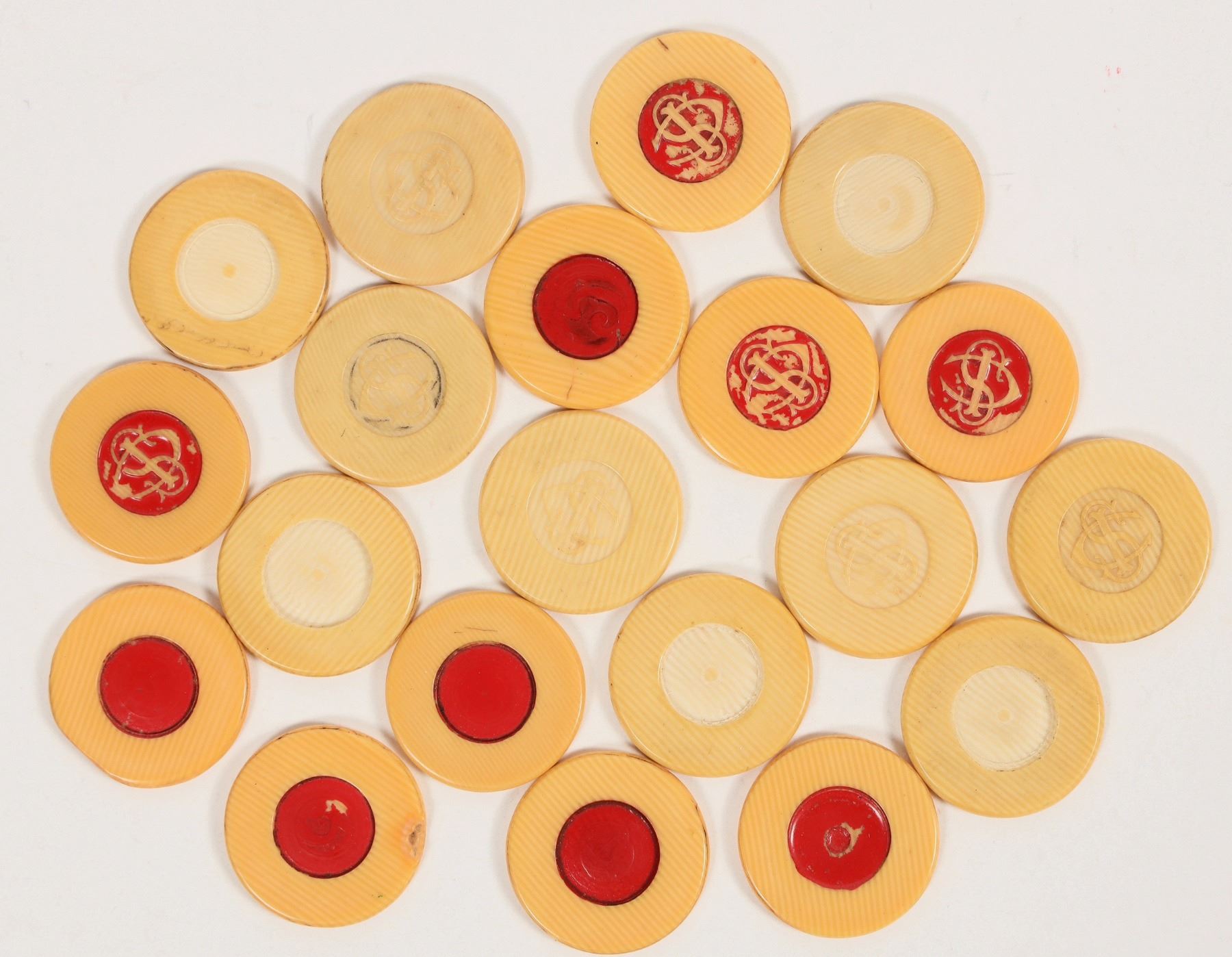 Twenty plastic gaming chips (33 mm), ten red center, ten white center with monogram "C S" in center.