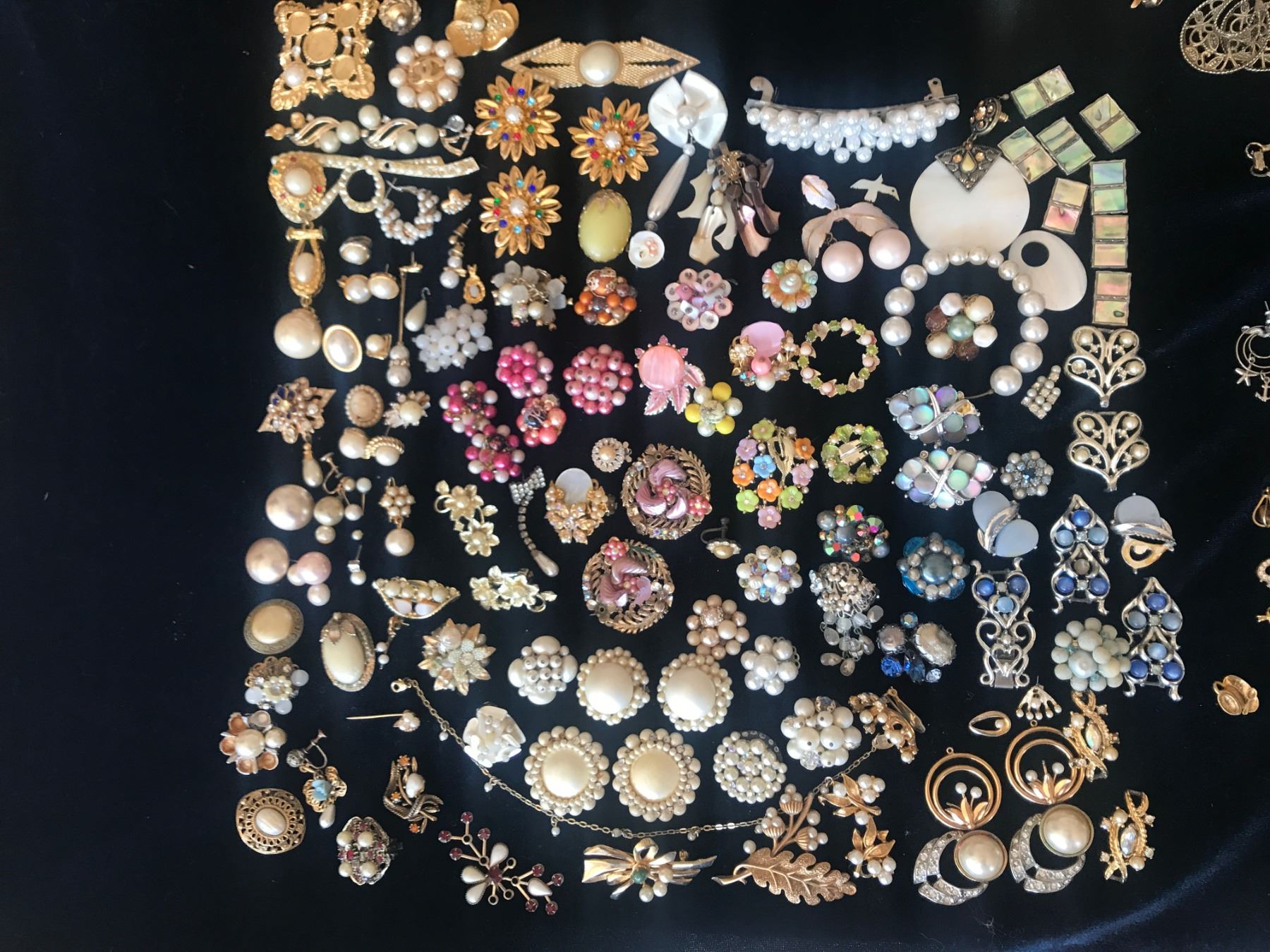 Designers include, K.J.L. for Avon, Chanel, Brooks, Ballet, Robert, Trifari, Marhill, Napier, and more in this mixed lot of over 125 pieces. Single earrings make up the majority of this group along with broaches, pins, clip-ons and screw backs in need of minor repair. Some highly collectible designer pieces. Perfect for a collector or vintage jewelry repair/resale business. c 1950s to present. Some semi-precious stones, zircons, shells, crystals, and imitation gemstones.