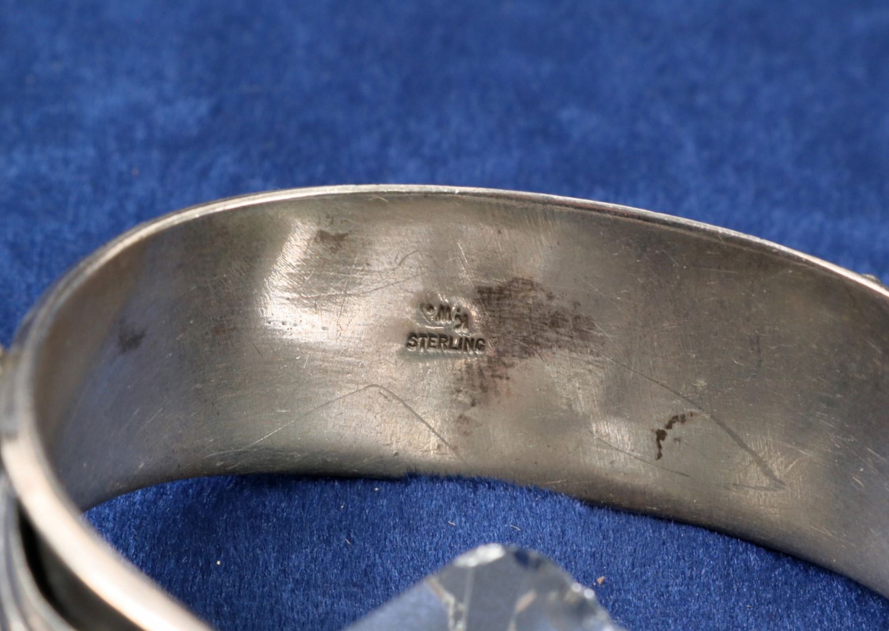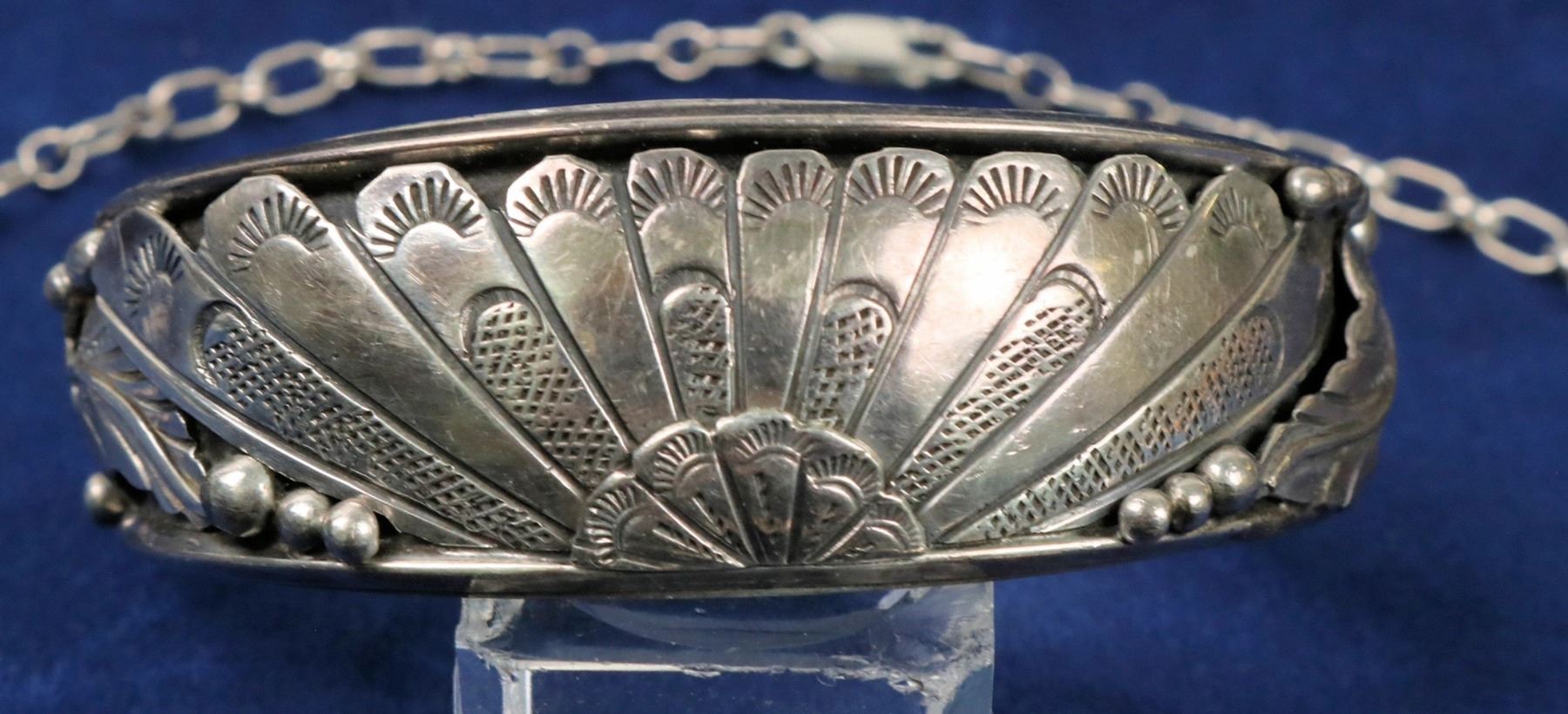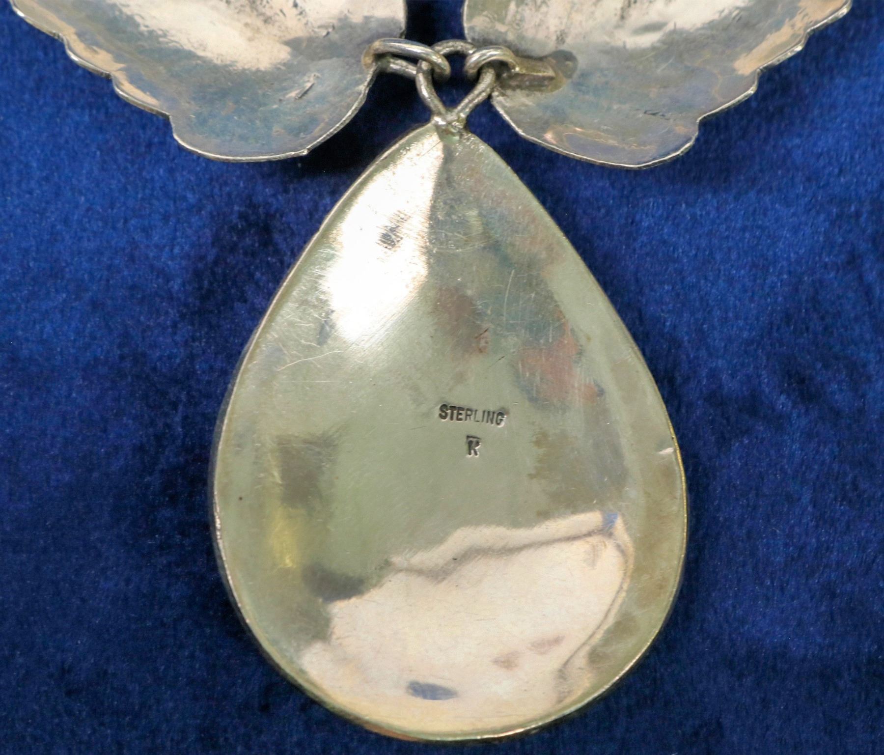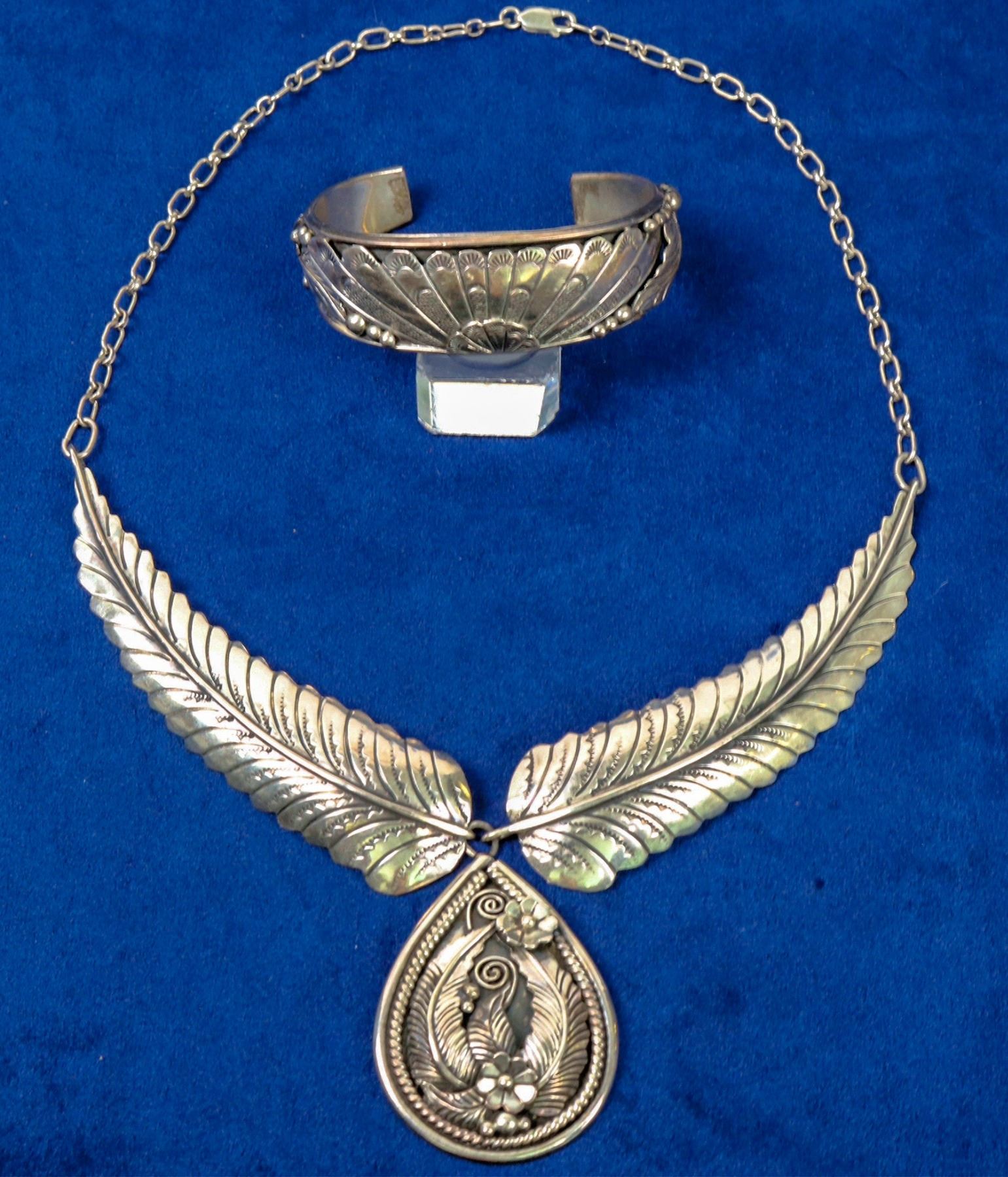 Navajo designed sterling silver feather necklace with pendant--feathers, flowers in an ornate teardrop shape. 18"long, 2" plus pendant. Incredible Navajo sterling cuff, signed K.W. Raised silver designs shadowbox-like--stylized feathers, leaves. Please inspect.