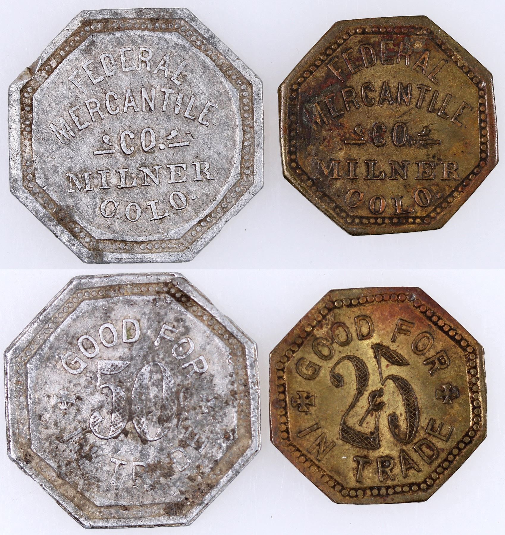 Lot of two: 1) FEDERAL / MERCANTILE / CO. / MILNER / COLO. // GOOD FOR / 25¢ / IN TRADE; Br., octagonal, 25 mm. 2) FEDERAL / MERCANTILE / CO. / MILNER / COLO. // GOOD FOR / 50¢ / IN TRADE; Al., octagonal, 28 mm.