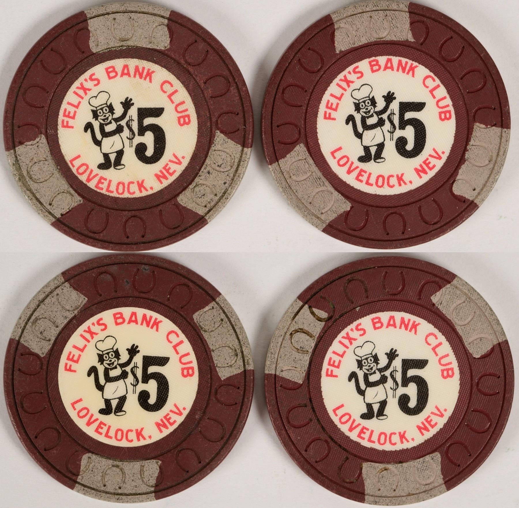 Two $5 chips from Felix's Bank Club (1953-1977). Felix Turillas' son left the Palace Club and the Northern Club in Reno and opened clubs in Winnemucca. Felix's Bank Club in Lovelock, Nevada, was opened in 1953 by Felix Turillas Junior.