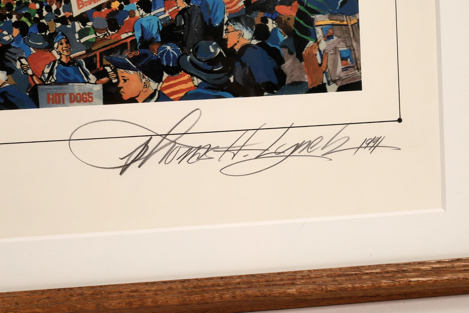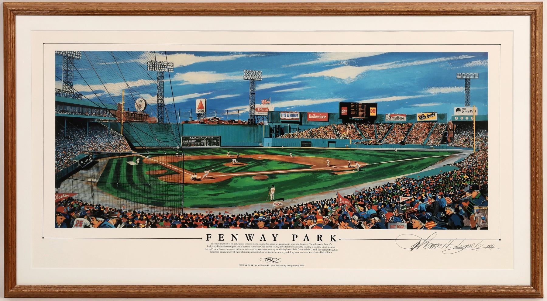 The crack of the bat on a home run ball, the roar of the crowd as the home team scores -- baseball is the national pastime, and this large print of Fenway Park captures the spirit of the game in the bright colors and patterns of the iconic facility. Boldly signed in pencil in the lower left by Massachusetts artist Thomas H Lynch. Frame is 41 x 22.5 inches, image is 32.75 x 13.25 inches. Professionally matted, glazed, and framed.