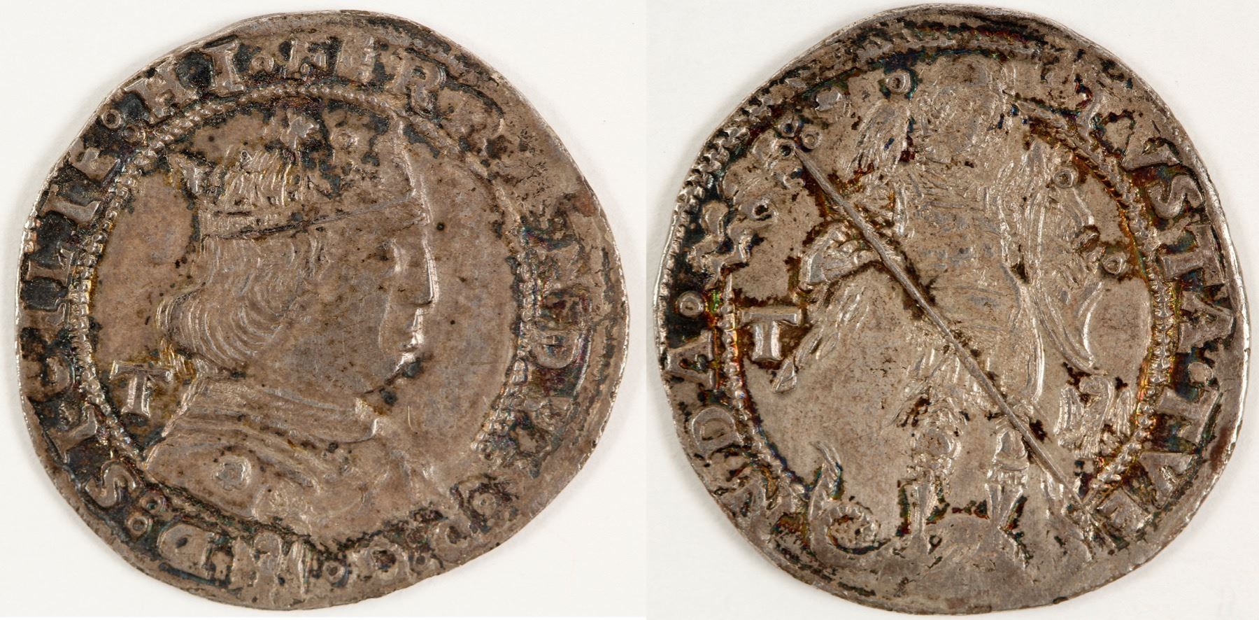 1458-1494. Silver coronation coin. Obverse features Ferdinand I of Aragon, King of Naples and Sicily. Reverse: St. Michael with dragon. Many details very obvious. An EF specimen sold at auction in London in 2011 for 190 English pounds. A132 L740. State: City: Date: HWAC# 60566