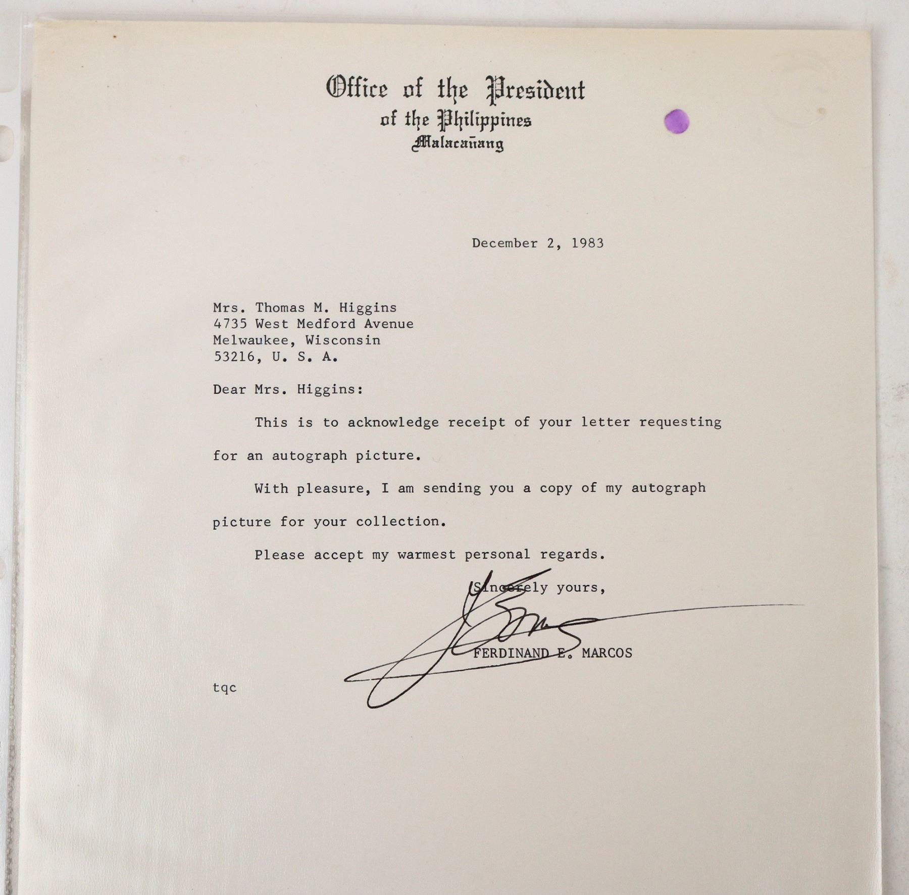 1983 Office of the President of the Philippines ALS by Ferdinand Marcos." Ferdinand Emmanuel Edralin Marcos Sr. was a Filipino lawyer, politician, dictator, and kleptocrat who served as the tenth president of the Philippines from 1965 to 1986. He ruled the country under martial law from 1972 to 1981, granting himself expanded powers under the 1973 Constitution." from Wikipedia. Fred H stated that his wife, Imelda Marcos, the shoe collector, moved to a Southern California location near him and had about 150 statues in her yard. Letter only, no photo.