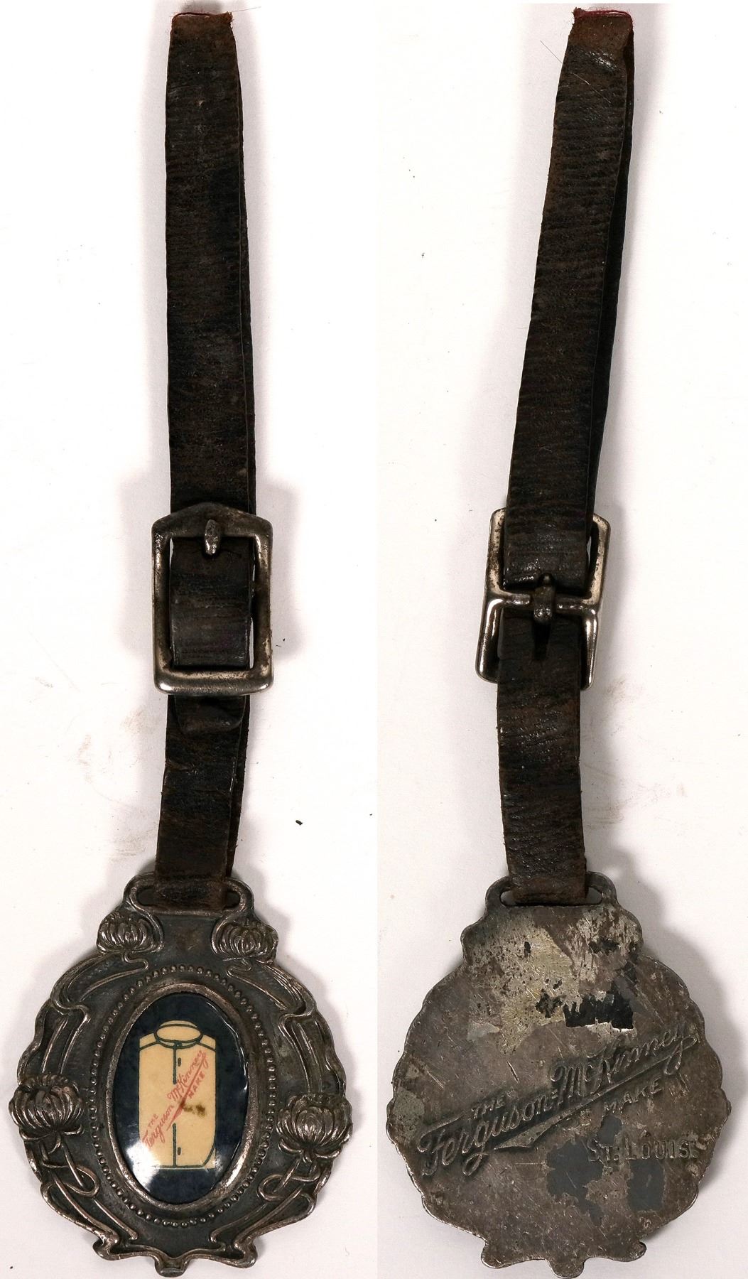 c1910. Trademark shirt celluloid inside. With leather strap. St. Louis. Front looks great. Back shows wear.