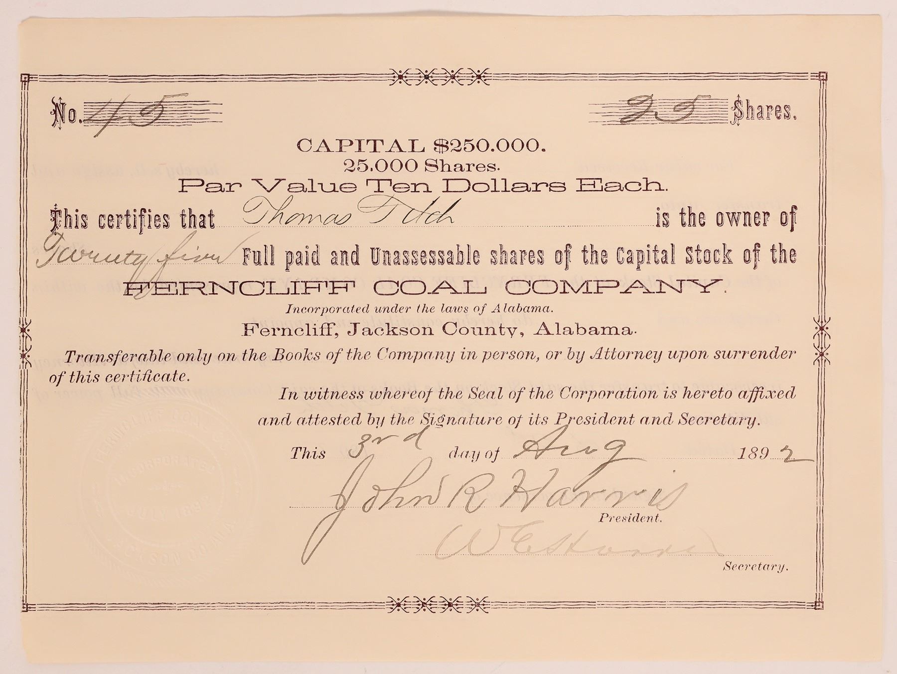 Rare 1892 Ferncliff Coal stock. Alabama Ken Prag Collection