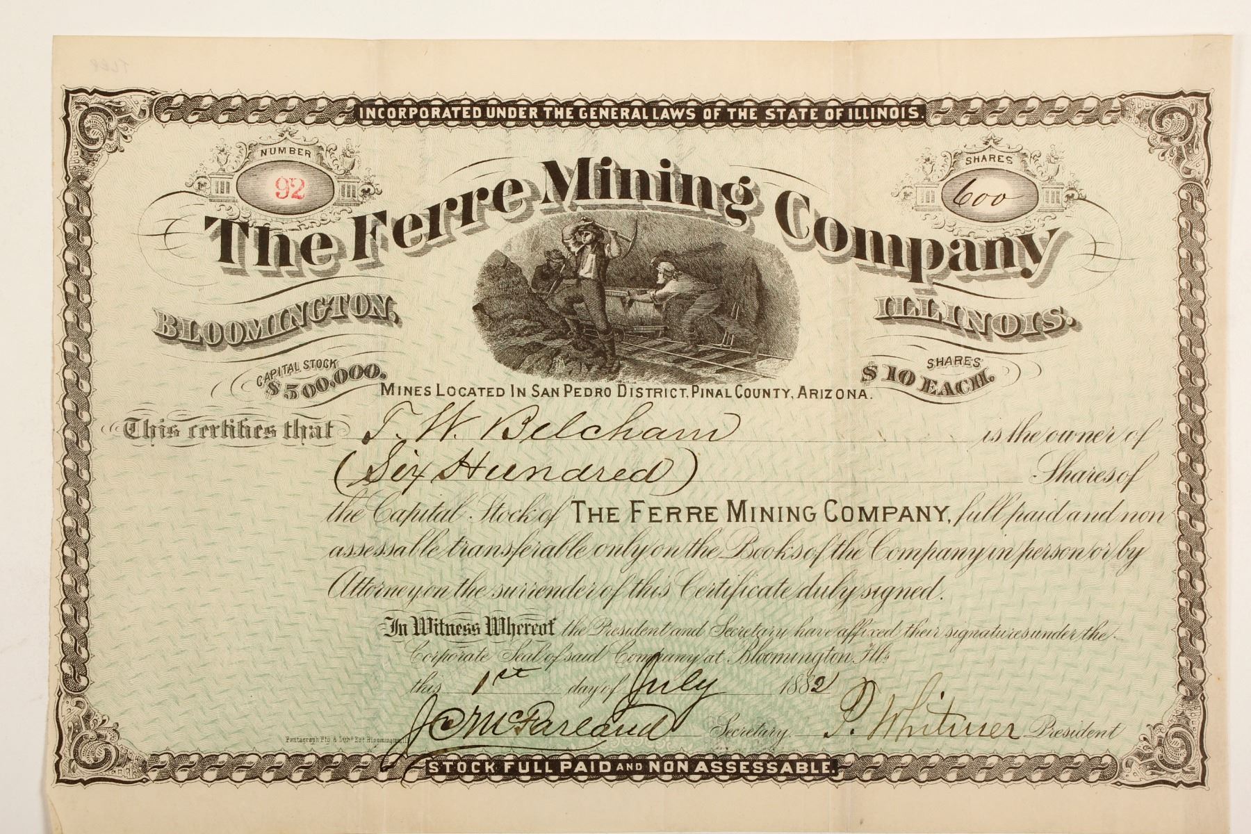 Number 92 for 600 shares to TW Belcham. Signed by president P Whitmer and secretary JC McFarland. Incorporated in Illinois with headquarters in Bloomington. Vignette of three underground miners and ore cart. Black border and print with green safety print on white paper. Very nice condition. Small dog ear lower left. Two vertical folds. The San Pedro District was originally in Pima County until its redistribution over a period of 15 years. It was a copper and gold district in the early 1860's and extensively reported by Browne in 1868.