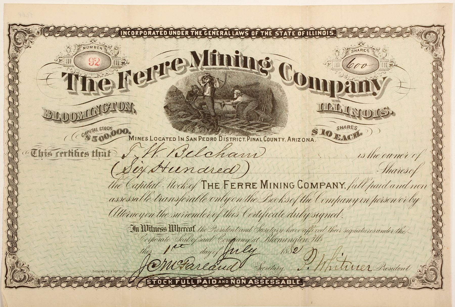 Number 92 for 600 shares to TW Belcham. Signed by president P Whitmer and secretary JC McFarland. Incorporated in Illinois with headquarters in Bloomington. Vignette of three underground miners and ore cart. Black border and print with green safety print on white paper. Very nice condition. Small dog ear lower left. Two vertical folds. The San Pedro District was originally in Pima County until its redistribution over a period of 15 years. It was a copper and gold district in the early 1860's and extensively reported by Browne in 1868.