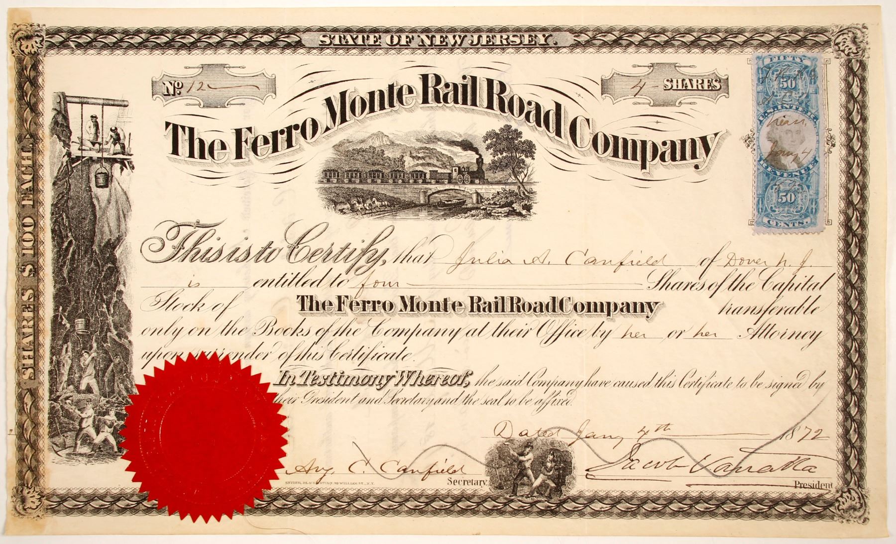 Four shares of The Ferro Monte Rail Road Company, no. 12, Founder's share to Julia A. Canfield of Donver, NJ. Possibly wife of the secretary who signed stock. Issued May, 1876. Revenue stamp. Unlisted in Cox. Ken Prag Collection. City: State: Date: HWAC# 75848