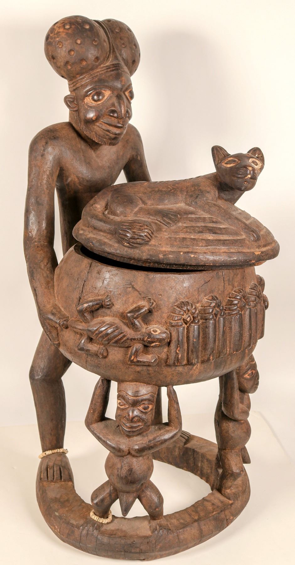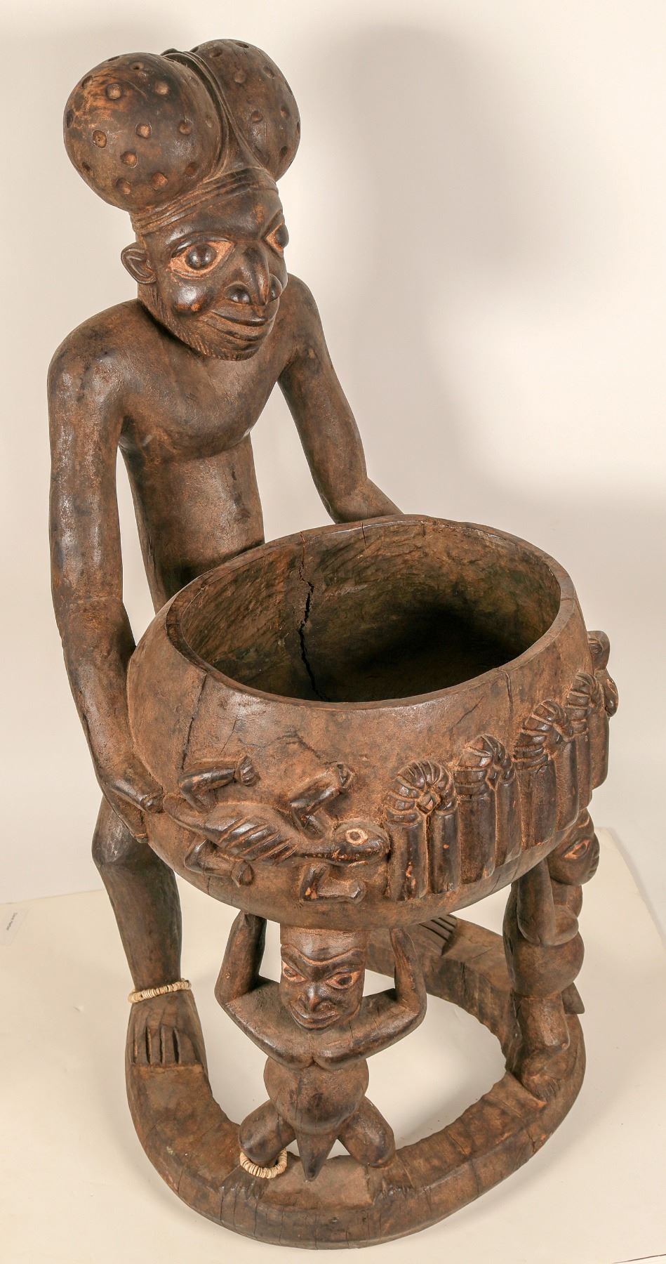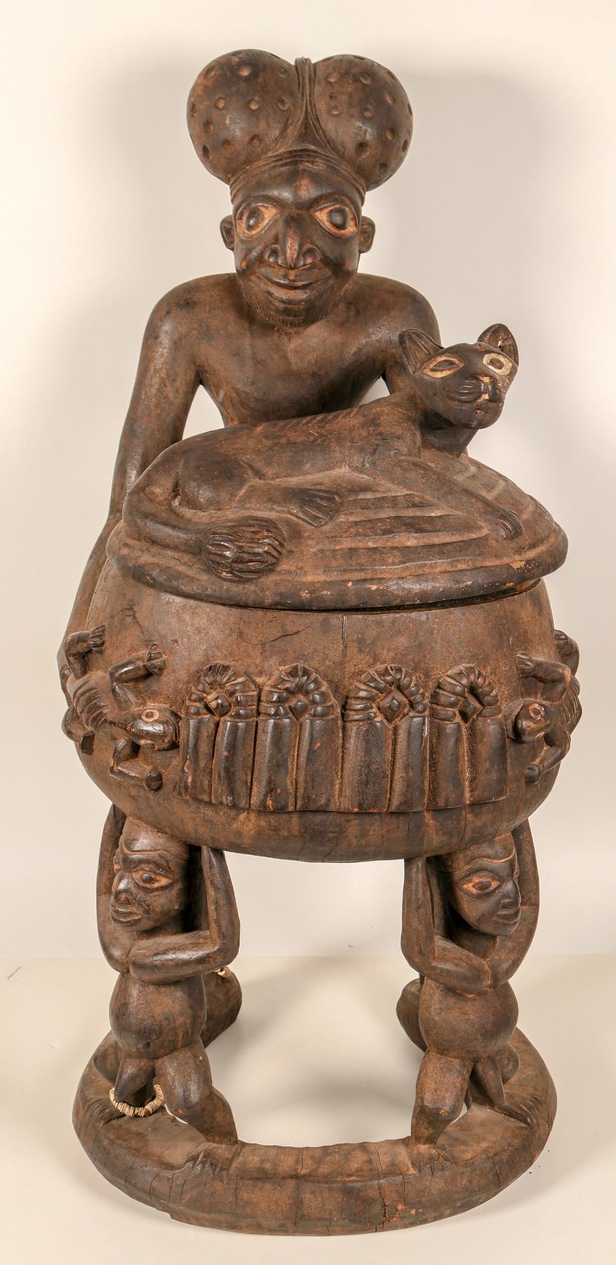 Here is a really strange and unusual piece of art. It is believed to be a medicine man, or a which doctor, performing a fertility ritual. This piece is carved from one tree alone, and sculpted into what you see here. The medicine man is hold a urn, which held coals or other material, and when lite sent smoke to the gods, to grant their wishes. The lid of the urn, has a Jaguar, so this tribe was a member of " The Jaquar Cult" Below the urn are two male statues , holding it up. It is 43" tall, and 20" wide at the base. Pretty good condition , except for a natural crack from the original tree, in the bottom of the urn. Wooden statue, stained black. Extremely rare, and said to be one of 2 known, with the other specimen at the Metropolitan Museum Of Art in New York. ( RH).