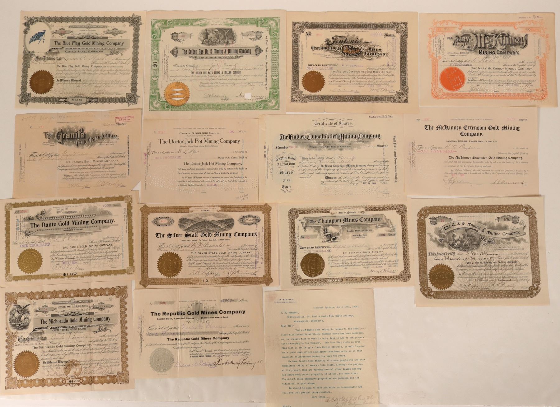 1) Mary McKinney Mining Company. Dateline Colorado Springs 1906. Incorporated 1892. Cancelled. 2) Teutonic Consolidated Gold Mines Company. Dateline Cripple Creek 1905. the word 'GOLD' is printed in gold. 3) Michordo God MC. Dateline 1905. Number 23.4) C & S Mining and Milling Company. Number 22. Dateline Denver 1907. Complex underground mining vignette. 5) Champion Mines Company. Number 62. Dateline 1908. Seal type vignette. Also Silver State with mountain vignette, Dante Gold MC, McKinney Extension Gold MC, Golden Age No. # 2 with underground mining vignette and the actual gold sel is cut cancelled, Findlay Consolidated MC, Doctor Jack Pot MC, Granite Gold MC, Republic Gold Mines Company. Blue Flag Mining Company with a American BLUE FLAG vignette! Also a letter regarding the Globe Hill Consolidated Mining Company. Good content.  City: Cripple Creek  State: Colorado  Date: 1000-1910