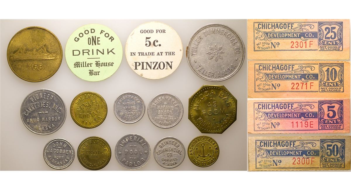 1) Anchorage, AK / Anchorage Alaska // GF Parking Token, good only in Parking Meter. 2) Craig, AK / Lib's & Jessie's Bar // GF 10c IT. 3) Gambell, AK / Reindeer Commercial Co. // GF 5c IT. 4) Juneau, AK / Imperial Pool Parlor // GF 5c. 5) Juneau, AK / Miller House Bar // GF One Drink. Green cardboard. 6) Chichagof, AK / Chichagoff Development Co. // GF 5c, 10c. 25c and 50c. Paper, set of four. 7) Port Alexander, AK / John Jacobsen // GF 12.5c IT. 8) Kodiak, AK / The Beachcombers, 1967 // GF One Drink. 9) Kodiak, AK / Mecca Bar 49 Room // GF 1d IT. 10) Seward/Kodiak, AK / Solly's // GF Rain Check One Snort. 11) Shishmaref, AK / Shishmaref Native Store // GF 5c IT. 12) Shishmaref, AK / Shishmaref Native Store // GF 25c IT. 13) Teller, AK / Teller Commercial Co. // GF 1d IT. 14) Valdez, AK / Pinzon // GF 5c IT. White cardboard. 15) Snug Harbor, AK / Pioneer Canneries // GF 1.25d Box of Clams.