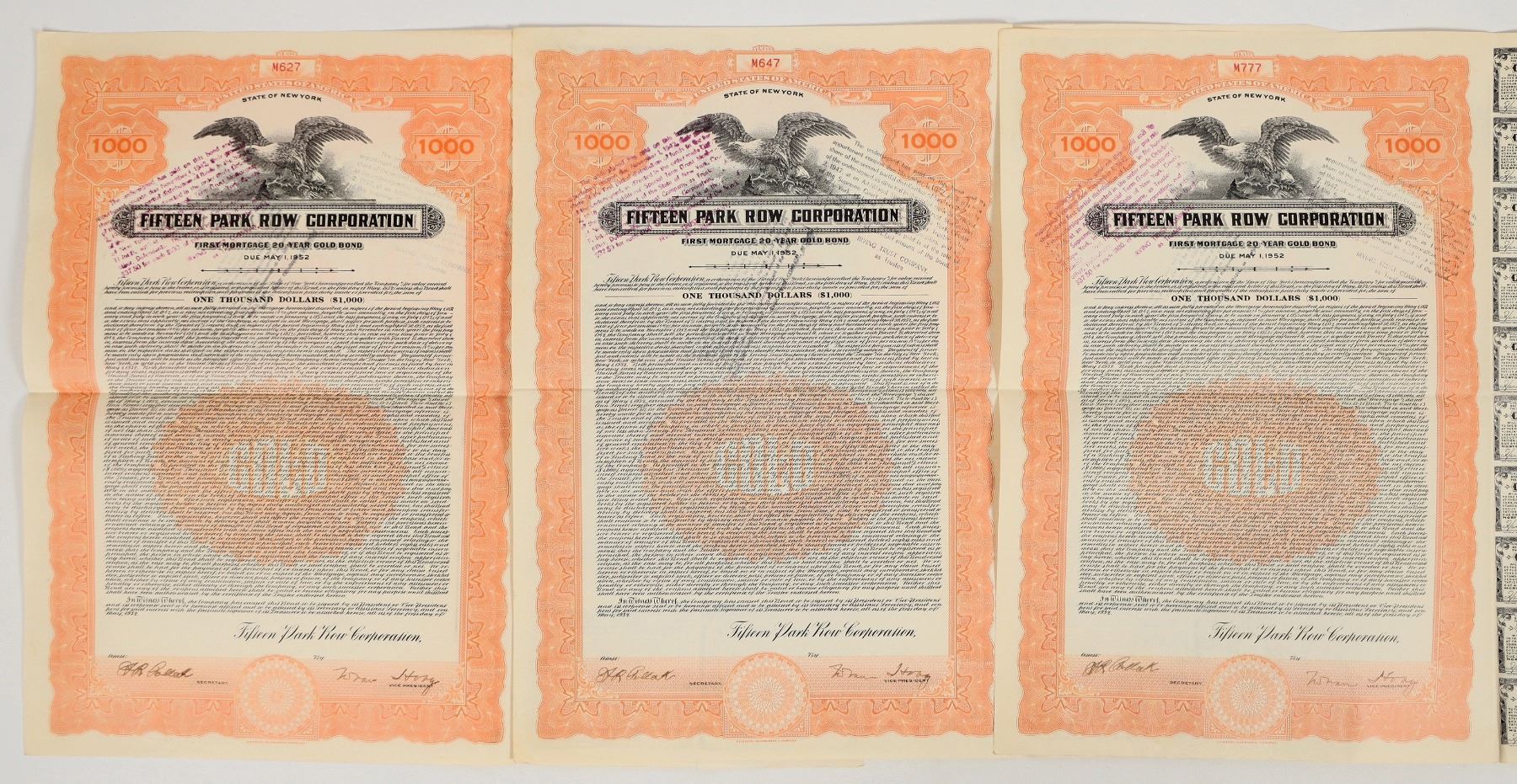 Lot of 3. I.U. Issued 1932. EF cond. Fifteen Park Row Corp, $1000, 4% gold bearer bond, coupons, Central BNC printer. Raising funds For the Park Row building New York City.