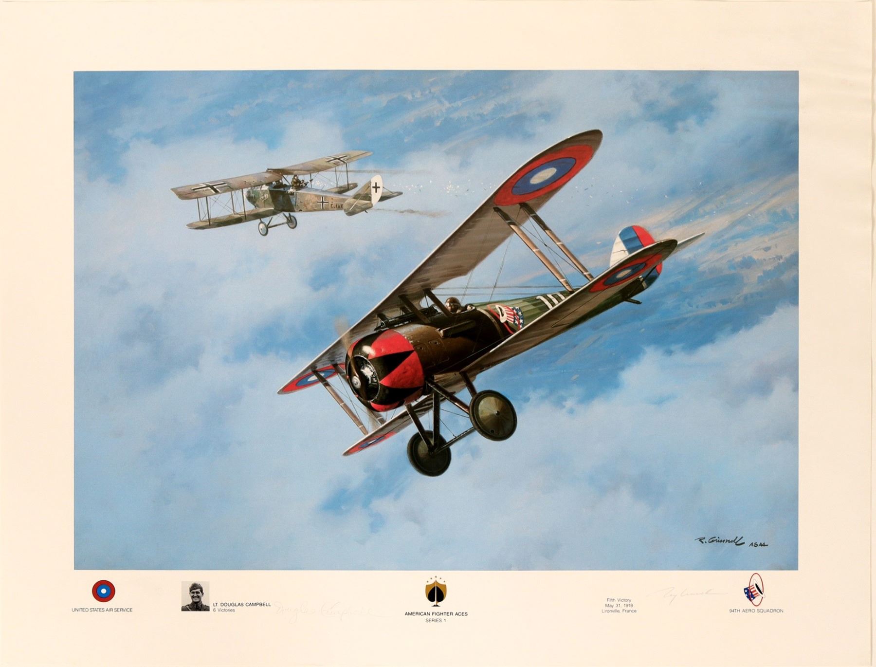 Print/autographed by Roy Grinnel. Intermittent dense clouds and strong winds had curtailed most flying between the Meuse and Moselle on 31 May, 1918. Nevertheless, Lt. Douglas Campbell and Lt. Eastman, of the 94th Aero Squadron, managed to get airborne in their Nieuport 28s. Fifth Victory" is hand signed by WW1 Ace Lt. Douglas Campbell, 94th Aero Squadron. This image depicts Lt. Campbell's fifth victory on May 31, 1918 over Lironville, France when he reached Ace status. In all, he had 6 victories. Unmounted and excellent condition.