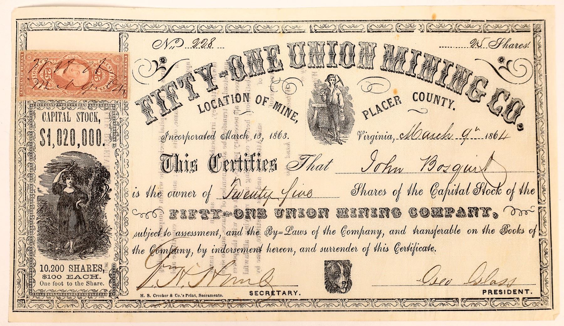 Cert. #228 issued to John Bosquit on March 9, 1864 for 25 shares. Signed by Wm. H. Hunt as Secretary and by Geo. Glass as president. Incorporated in Virginia on March 13, 1863 and capitalized at $1,020,000; 10,200 shares at $100 per. Virginia was opened to mining in the year 1852, by the discovery of gold on the adjoining hills and ravines. The want of water during the dry season retarded the work of miners for two or three years subsequent, which was finally remedied by the introduction of water by the same canal which conveyed water into the Gold Hill district. In 1853, a company of miners built a railroad track from Virginia Hill to the Auburn 'ravine, for the transportation of ore. This road was certainly the pioneer railroad of Placer, if not the first laid down in the State for any purpose. The work was finally abandoned by the company, and its labor was redirected towards the introduction of water, through canals, direct to the tops of the various hills lying in and composing the Virginia district. John Bosquit (or Bosquet) was a representative for Placer County in the 1865 California Assembly. He died Nov. 9, 1868. [Ref: Bancroft, Gudde] Uncancelled. Vignette, showing a miner with a pick-axe, in front of a mine entrance. And another of a woman at left. A red brown 25 cent “Protest” Internal Revenue stamp is affixed. Printed by H.S. Crocker & Co., Sacramento.