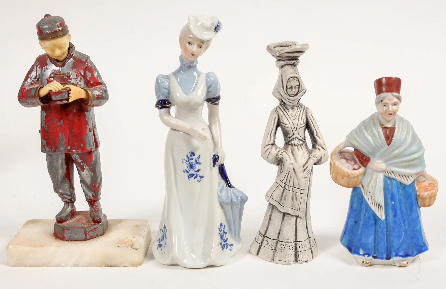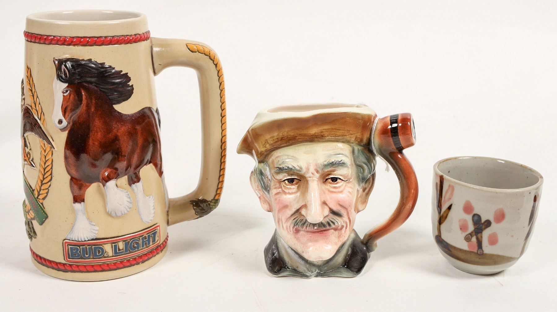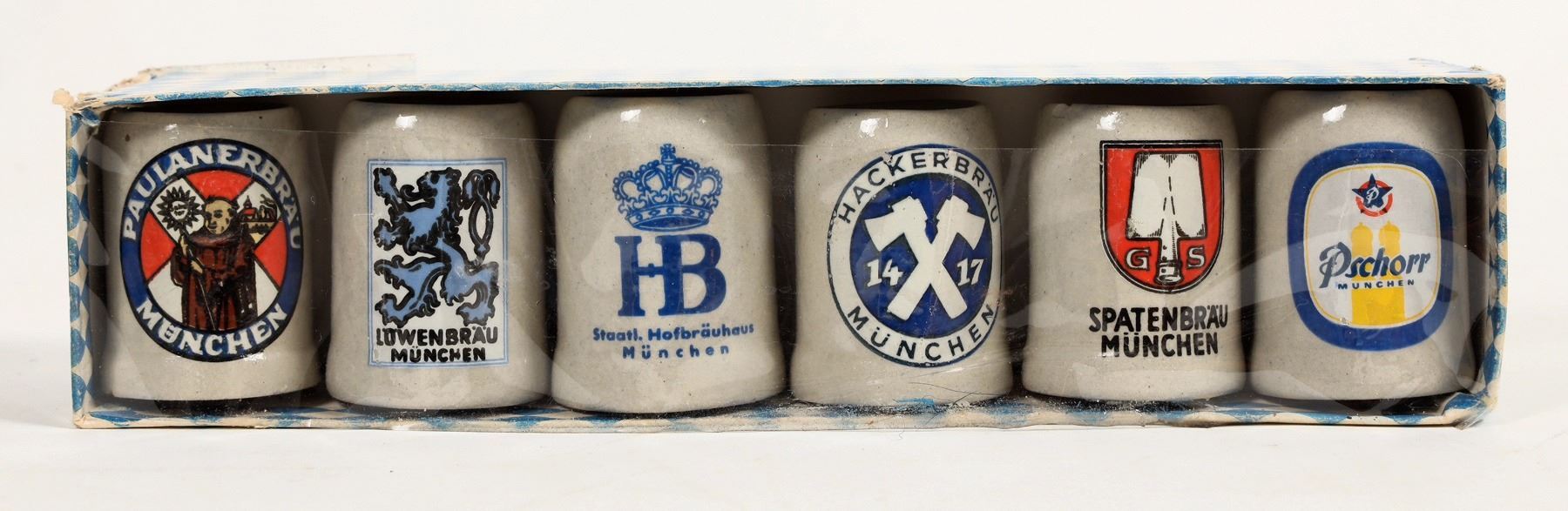 A grab bag of miscellaneous items including figurines, ceramics, metal kitchenware, and novelties. Some notable items include a ceramic music box/functional bottle in the shape of a violin which plays Beethoven's Fifth, a lovely copper butter dish, an elegant metal teapot, and a set of ceramic shot glasses with the logos of various German beer brands. Items in good condition; see photos.