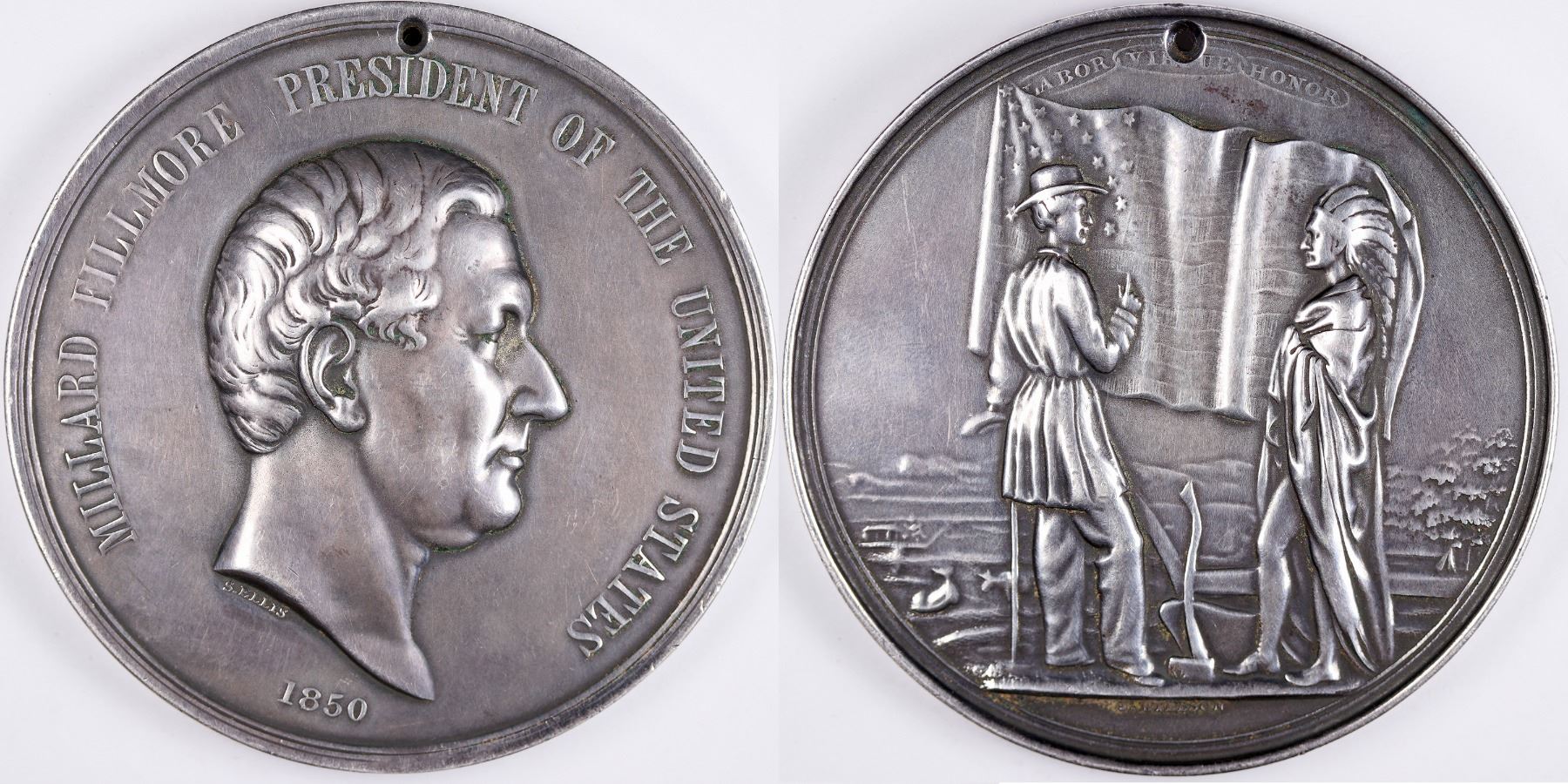 Silver-plated post 1900 bronze U.S. mint restrike of the 1850 Millard Fillmore Indian Peace Medal. Pre-1900 bronze have incomplete defining upper rims on the three ovals enclosing LABOR VIRTUE HONOR on the reverse. A new reverse die was made post-1900 with the rings intact. Another clue to its post 1900 production are the lathe lines on. the edge. The medal offered here has been drilled, buffed to simulate wear, and the silver plated. A rough patch in the plating on the bridge of the nose indicates plating. Lack of wear inside the hole indicates it was never worn. Finally, the medal is worn on the high points with no dings or other evidence of wear in the fields. A collectible piece, but not a "genuine" peace medal from 1850.