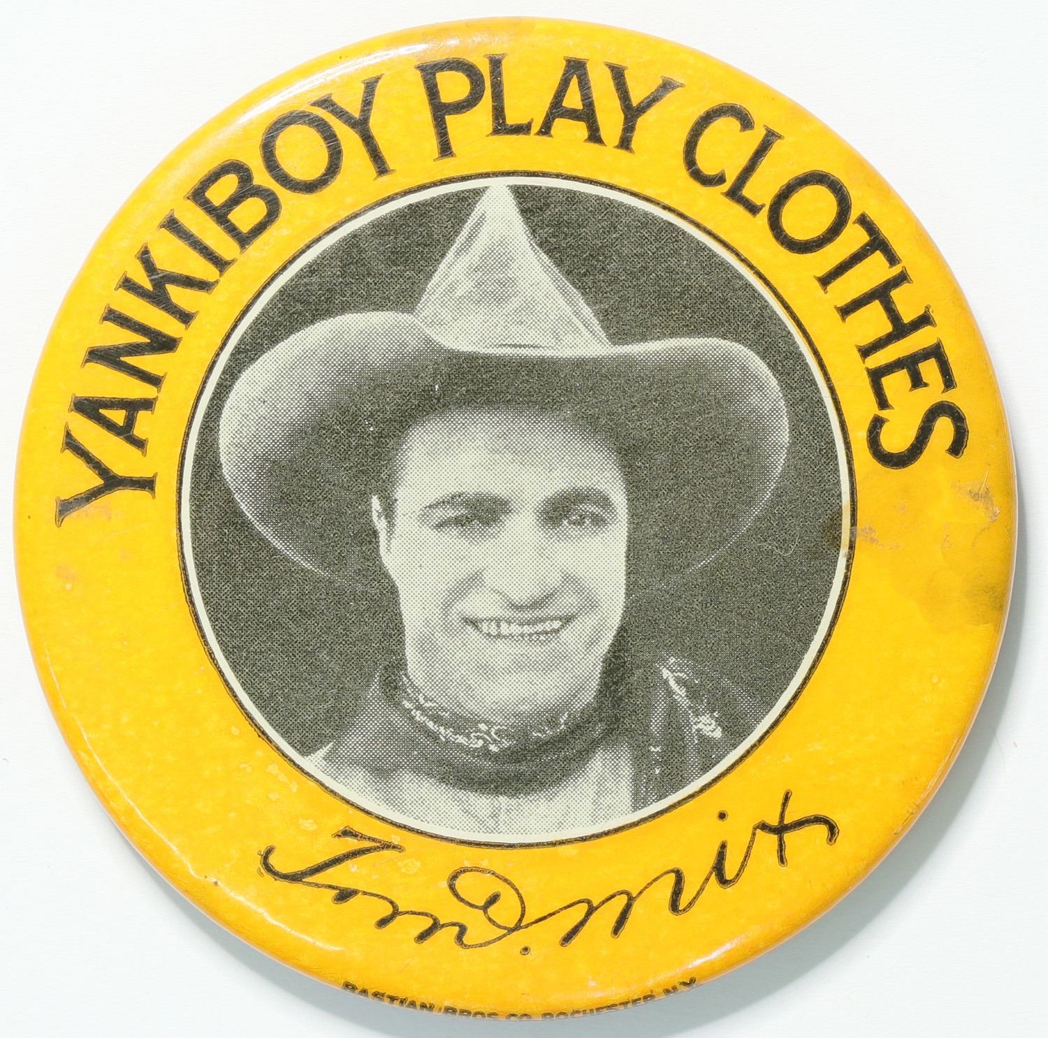 The famous film cowboy advertising "Yankiboy Play Clothes" on this 53 mm photo mirror. The star of many early Western movies between 1909 and 1935, Mix appeared in 291 films, all but nine of which were silent movies. He was Hollywood's first Western star and helped define the genre as it emerged in the early days of the cinema.