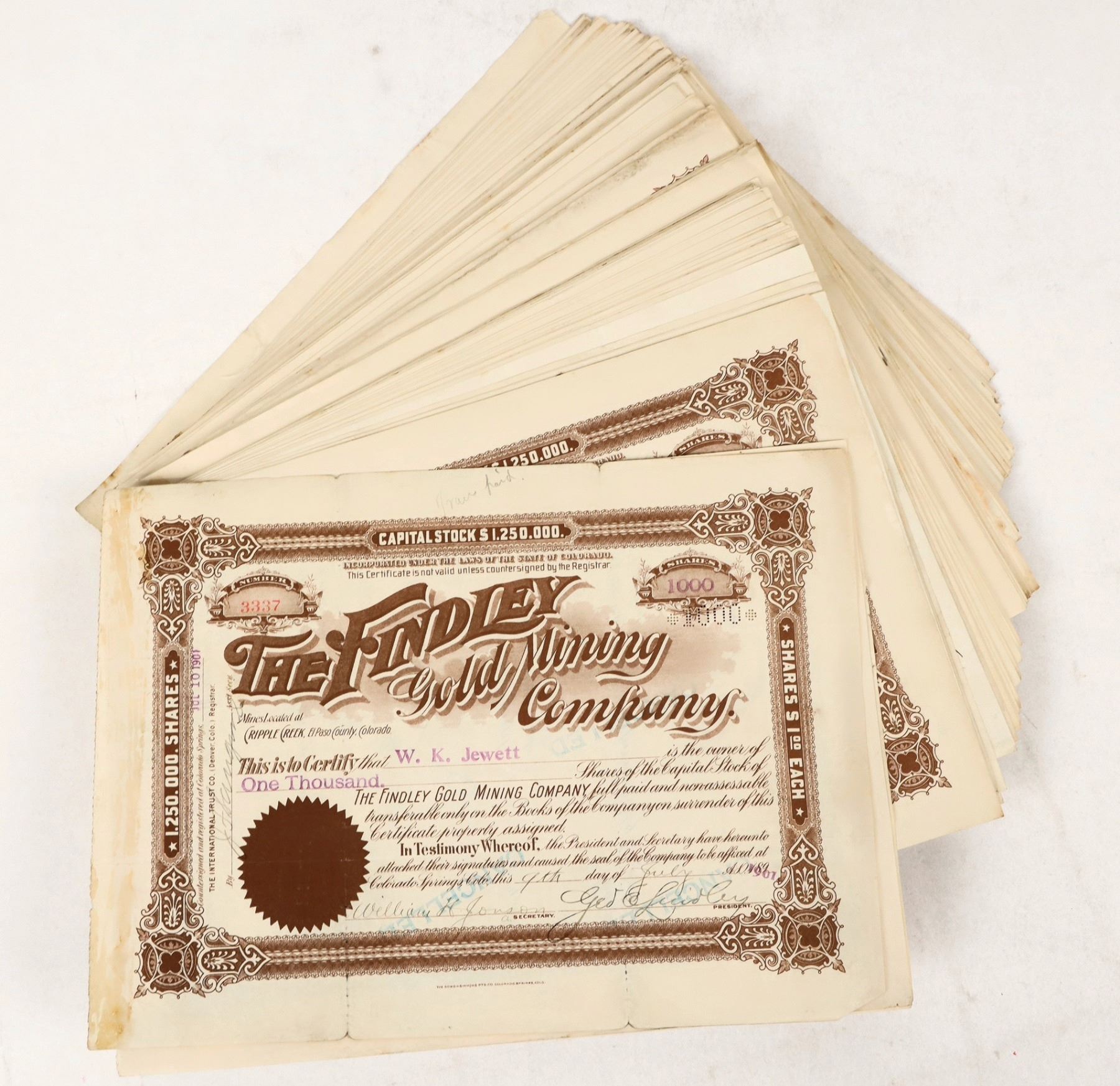 Group of approx. 200 stock certificates from the Findley Gold Mining Company, which operated in Colorado's historic Cripple Creek mining district. Issued 1901 through 1902. All issued, all cancelled using hole punch or ink stamp cancellations. 10.75"x7.75" certs, toning and wear throughout lot; see photos.