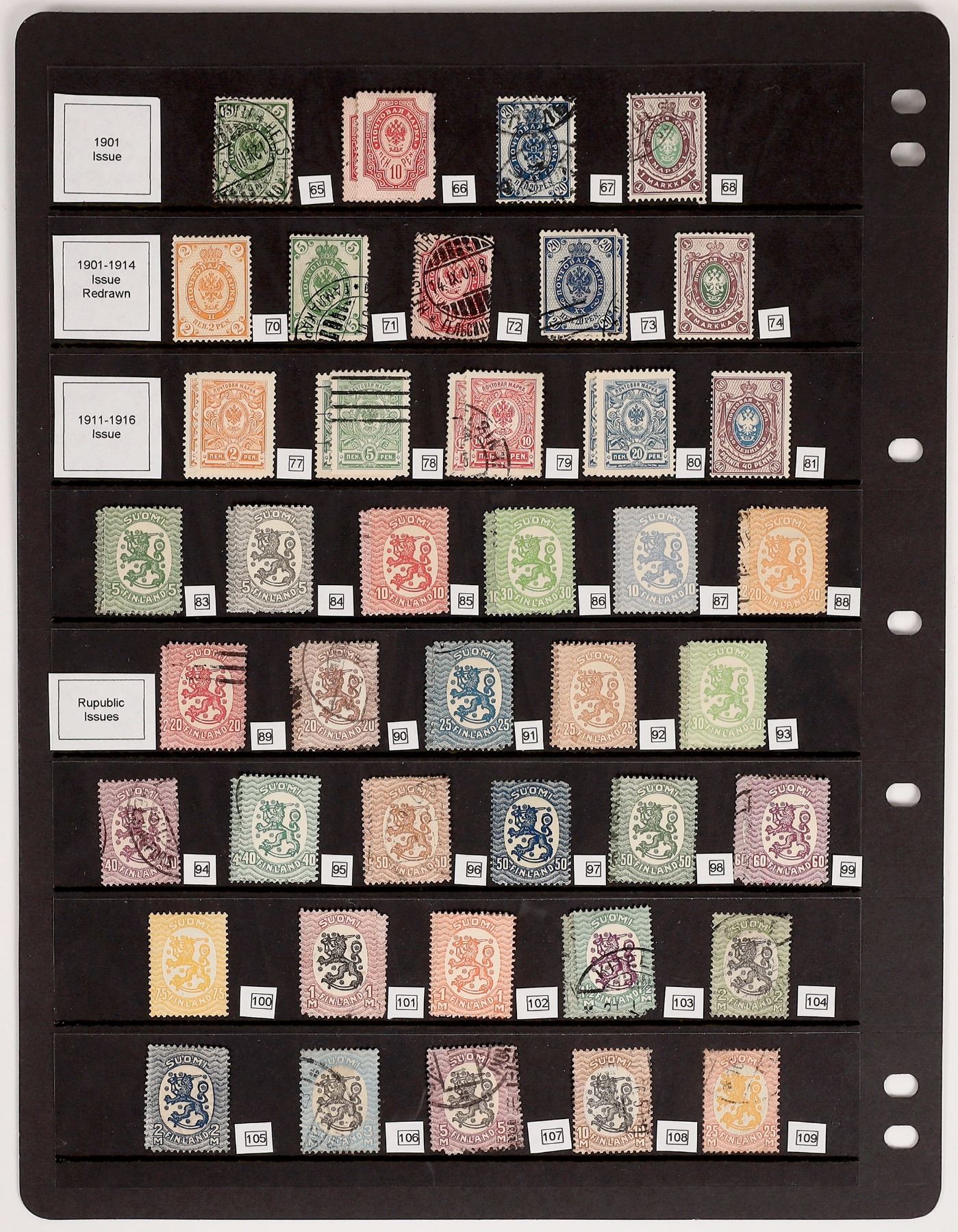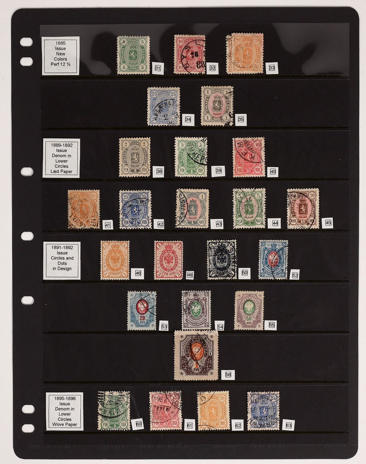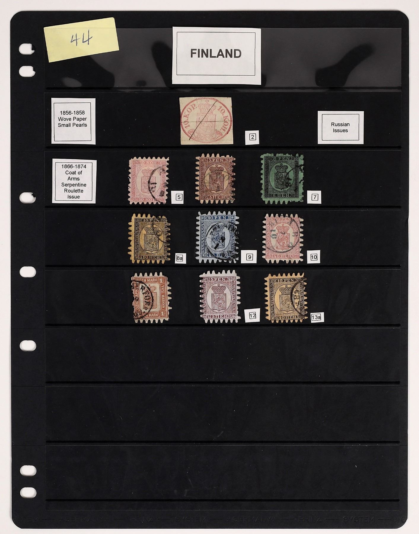 Finland. 1856-1916 issues, noted 1856 10k, 1866-74 roulettes (x9, 1m faulty, 5p brown mint), 1875-81 32p & 1m, etc., owner's 2005 Scott $3,470, good basis for further expansion.