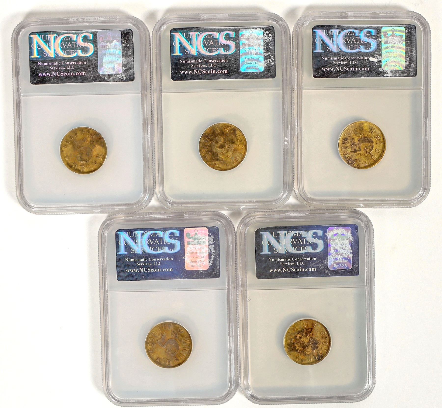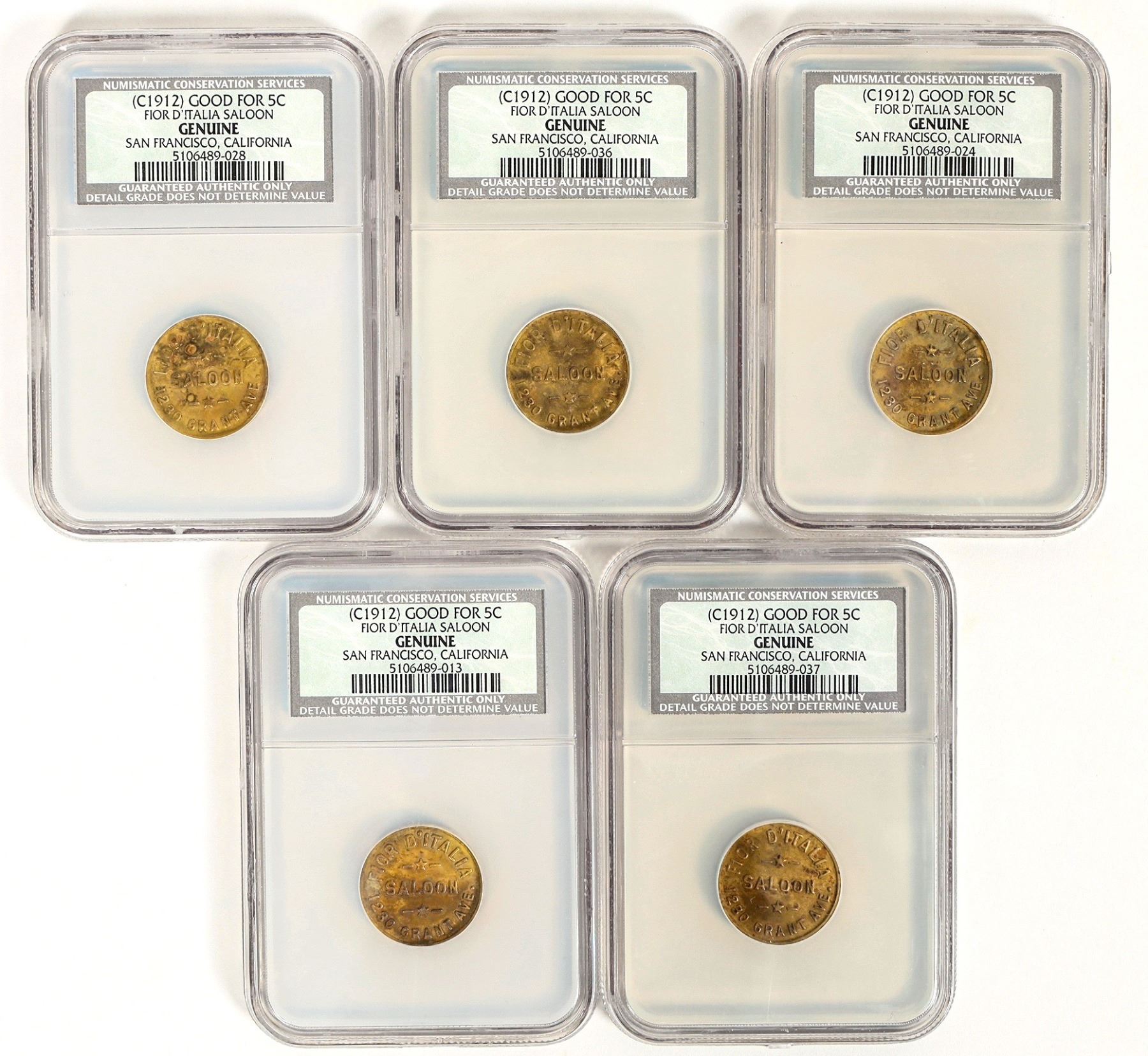 Five certified GENUINE tokens by Numismatic Conservation Services: FIOR D'ITALIA / SALOON / 1230 GRANT AVE. // GOOD FOR / 5¢ / DRINK ; Br. rd., 21 mm. Carlo & Antonio Boggiano were the proprietors in 1912 according to tokencatalog.com. Founded in 1886, it existed until 2012 in its North Beach location.