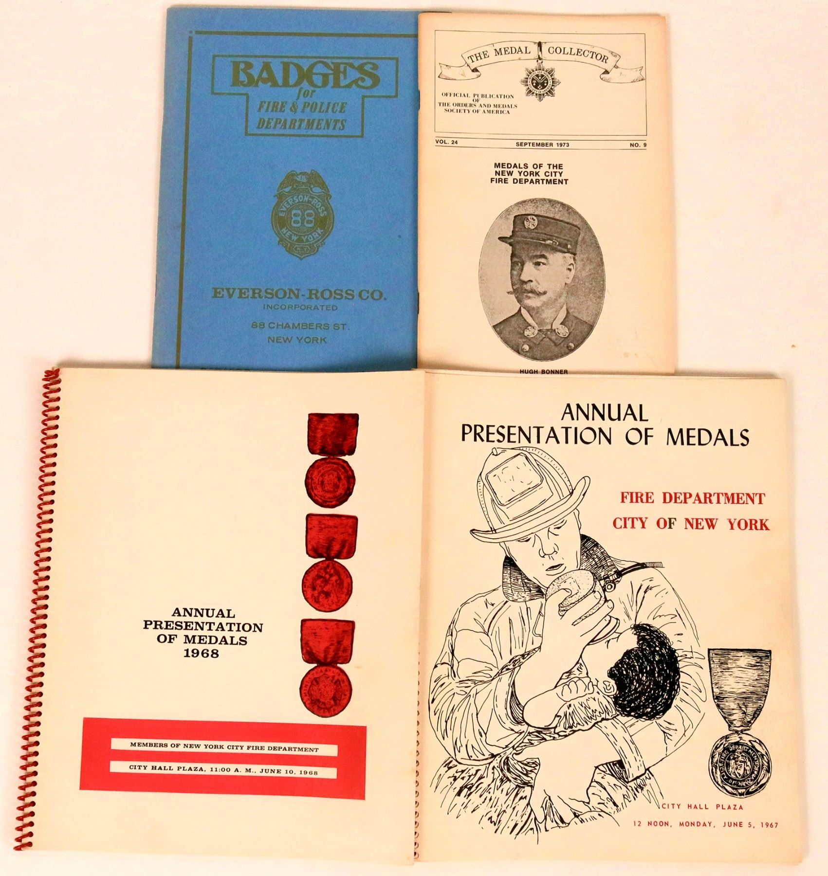 1) Badges for Fire and Police Departments, Everson-Ross, Inc. New York Catalog No. 29, 1910, 44 pages 2) The Fire Service and It's Emblems Publication by International Association of Fire Chiefs, April 1941, 15 pages 3) The Medal Collector, Medals of the New York Fire Department, September, 1973, 40 pages 4-5) New York City Fire Department Annual Presentation of Medals for 1967 & 1968 An invaluable reference for badge and medal collectors, firefighting memorabilia collectors and researchers.