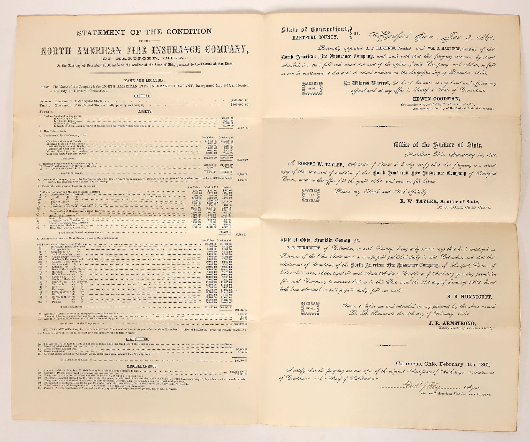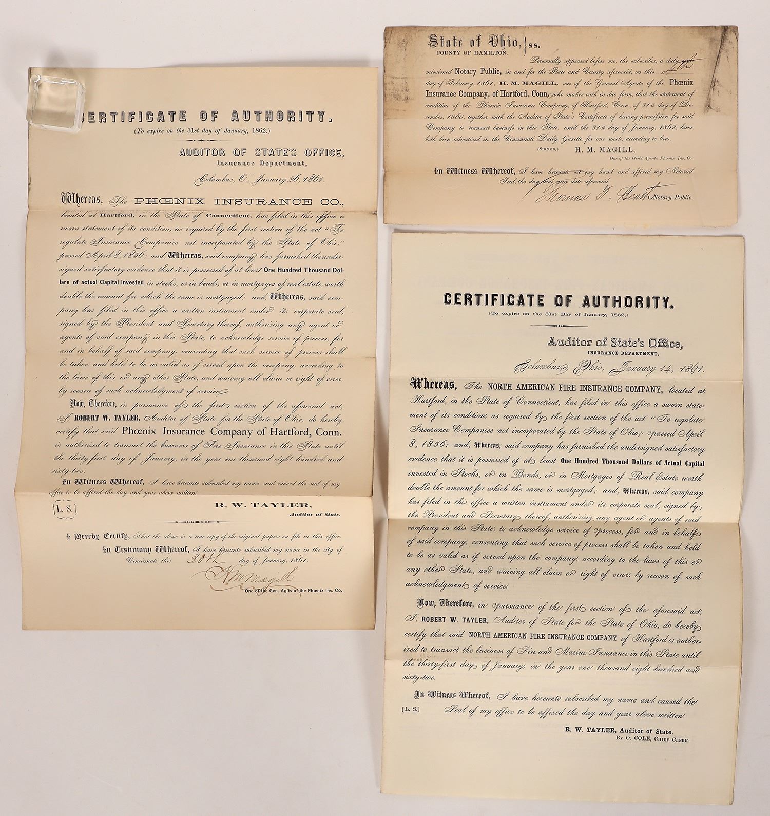Two Certificates of Authority for insurance companies to do business in the state of Ohio: The Phoenix Insurance Company & The North American Fire Insurance Company. Dated 1861.[ Ohio